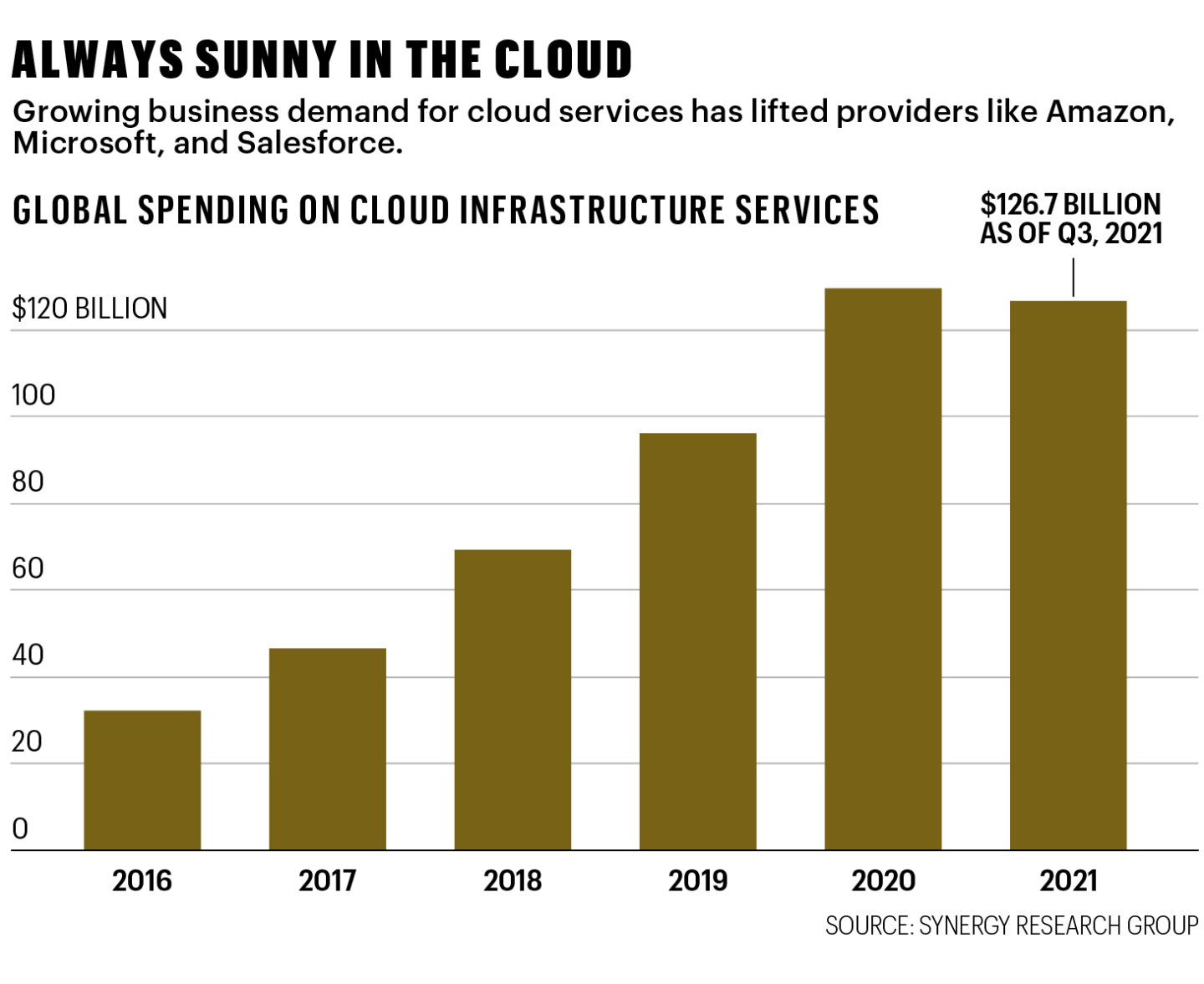 For investors angling to get in on the trend of companies transitioning onto the cloud, Nuveen’s Malik favors Salesforce, the software provider that helps businesses with front-office functions including marketing and customer service. The pandemic, Malik notes, has only accelerated businesses’ reliance on front-office software, and Salesforce is a top player in that space. The firm’s customer contracts have “annual pricing power baked in, which helps in the short term,” she adds. Salesforce stock trades at roughly 77 times forward earnings, but the company is expected to grow revenues by over 20% next year.