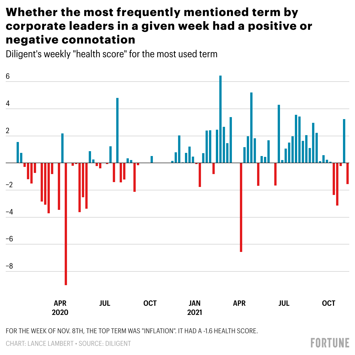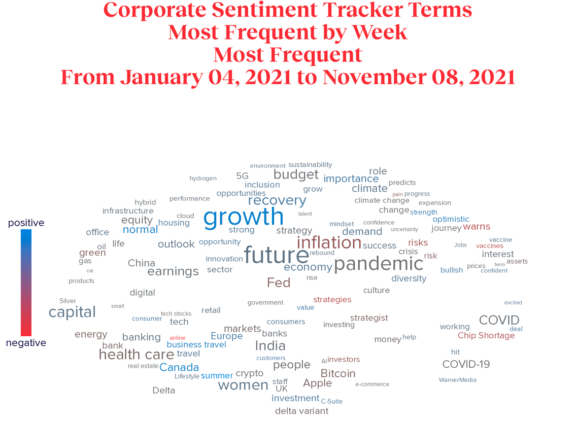 - After seeing sentiment among business executives skyrocket earlier this year, it’s now souring. In 2020, the top term used by business leaders had a negative or neutral connotation in 29 out of 52 weeks. That changed this year. Through 40 weeks of 2021, it was positive 33times. But it has once again shifted: In the most recent five-week period, the top term had a negative connotation four times. The culprit? Inflation.