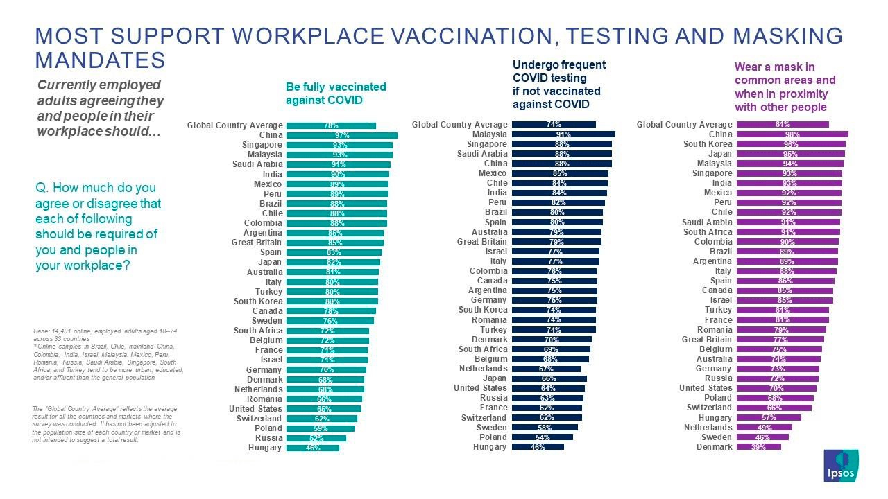 As U.S. politicians continue to battle over whether businesses can impose COVID-19 vaccine mandates on their workforce, employees across the world seem to have already settled the issue: On average, most support mandates—in some places, in overwhelming numbers.