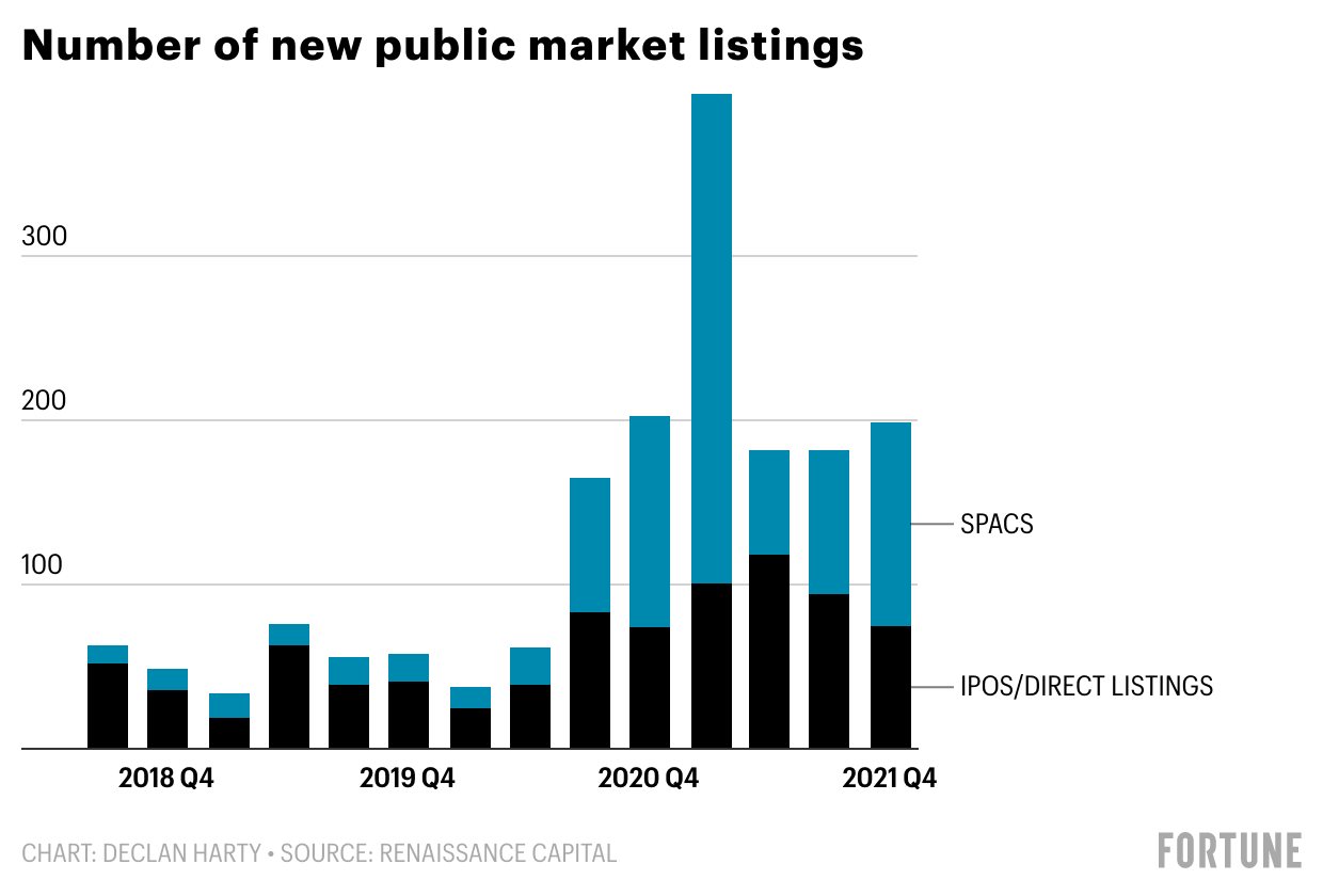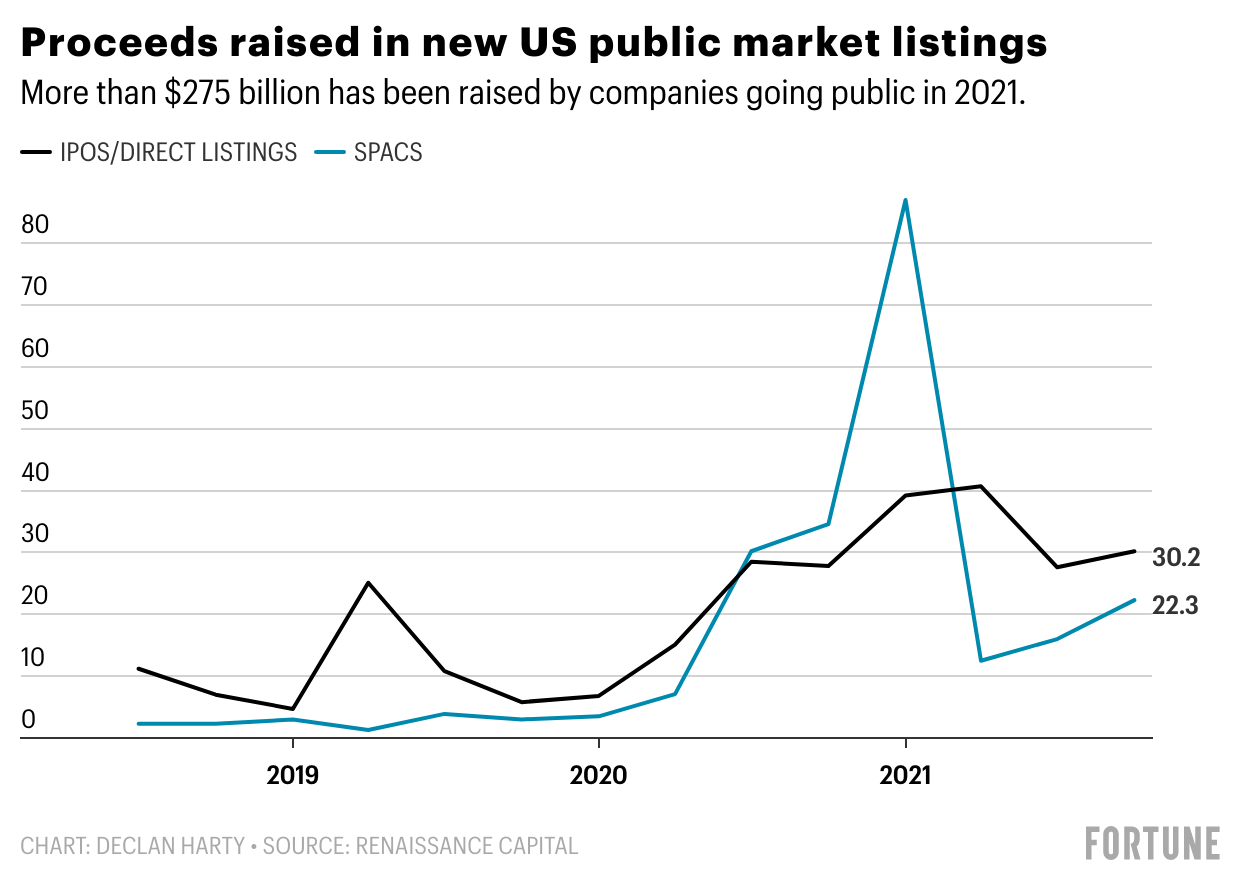 With the Federal Reserve pumping billions into the financial system since the COVID-19 pandemic took hold in the U.S., stocks have been on a complete tear. A record 388 operating companies debuted in the U.S. in 2021, raising $30.2 billion in the process, as of Dec. 7, according to data from Renaissance Capital. For the sake of comparison, more companies have gone public in 2021 than in 2019 and 2020 combined. The numbers become even more staggering when including SPACs—the blank-check structures that ballooned in popularity earlier in the year and have had surprising staying power. Including SPACs, 962 companies raised a total $275.5 billion in 2021. (That marks a huge jump from 2019 when just 62 SPACs listed in the U.S.)