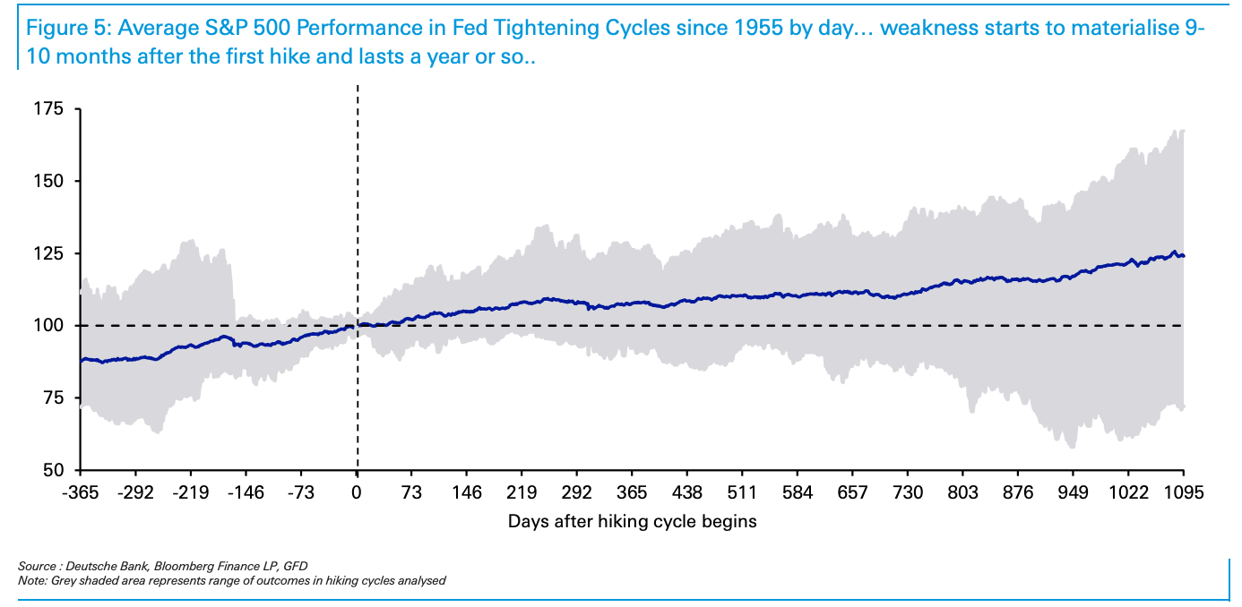 The upshot, according to the Deutsche Bank analysts, is “on average over those 13 hiking cycles, the S&P 500 goes a period of over a year without a positive return from 9-10 months after the start of the hiking cycle” (emphasis added). Still, as the chart also shows, “the index then commences its advance 2 years after the tightening commences.”