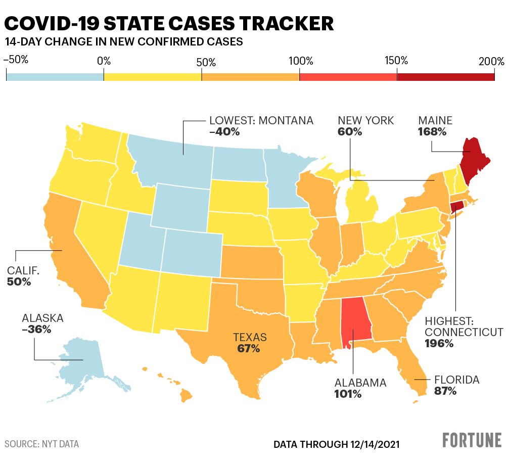 Currently, the CDC classifies community transmission of the virus as “high” in 80% of U.S. counties. Nationally, the average number of new coronavirus cases reported each day has risen 46% in the past two weeks, to roughly 122,000 per day, according to New York Times data. States with the biggest gain in new cases in that period are Connecticut (up 196%) and Maine (up 168%).