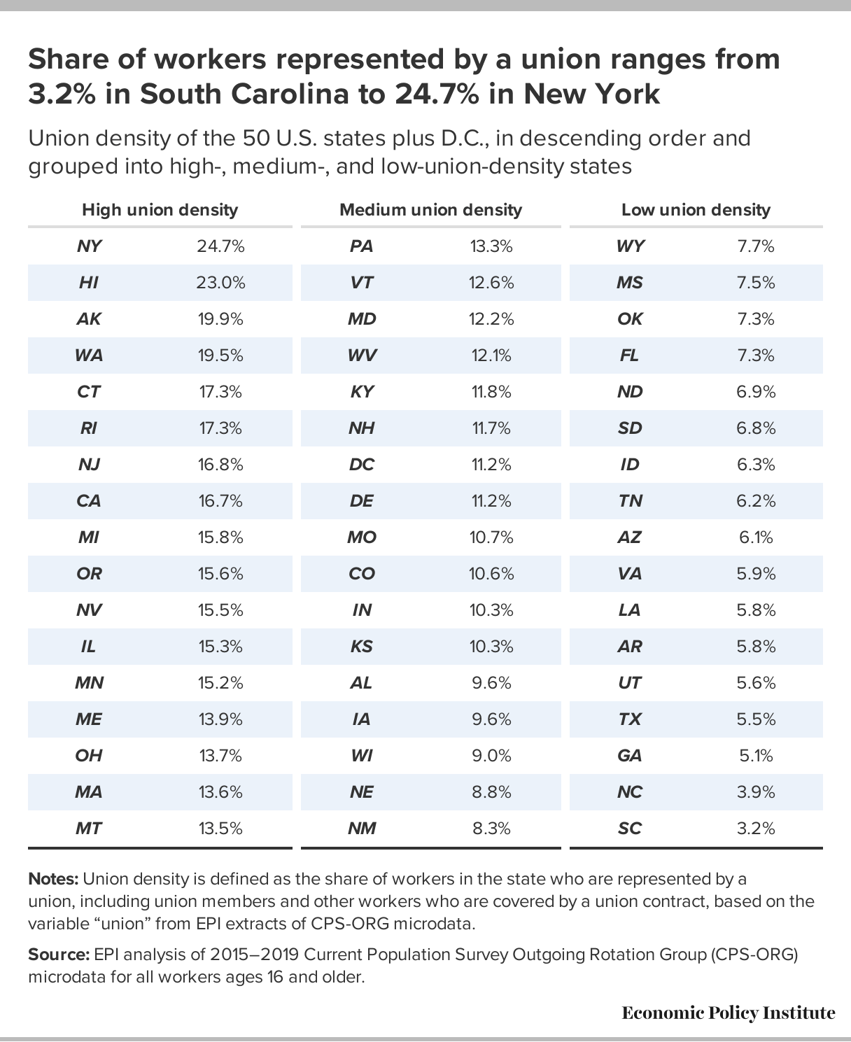 EPI’s study comes as the U.S. Senate considers the Protecting the Right to Organize (PRO) Act, which would make it easier to organize unions by protecting low-level supervisors and managers from anti-union discrimination. The PRO Act would make undocumented workers eligible for damages if their labor rights are violated, and clarify rules regarding “joint employers,” when an employee technically works for two companies.