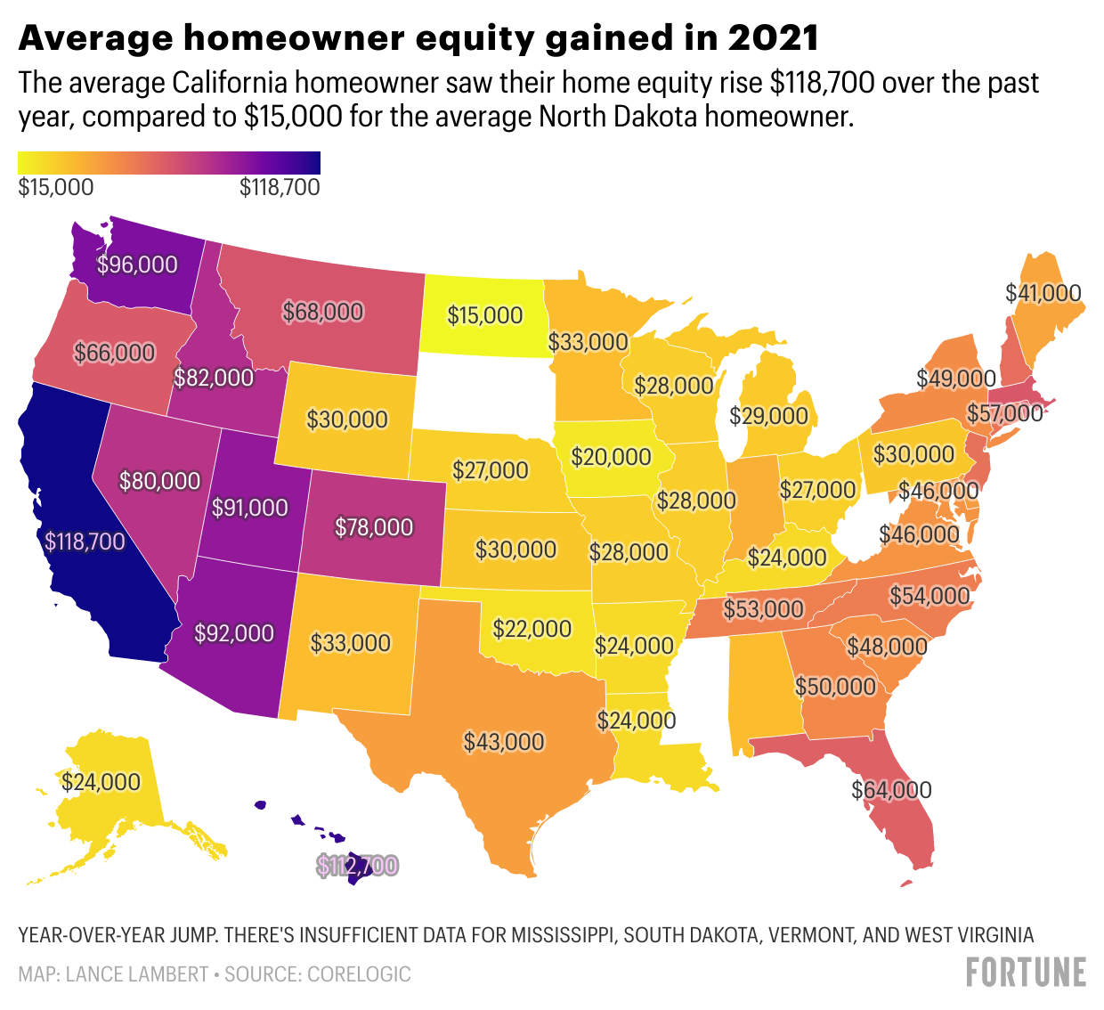 Over the past year, the average homeowner in California—a state with a $77,358 median household income—have seen their home equity (the home’s fair market value minus the mortgage balance) soar $118,700. They’re followed by homeowners in Hawaii ($112,700), Washington ($96,000), Arizona ($92,000) Utah ($91,000), and Idaho ($82,000). Meanwhile, the smallest jump ($15,000) occurred in North Dakota—a state with a $258,900 median home price.