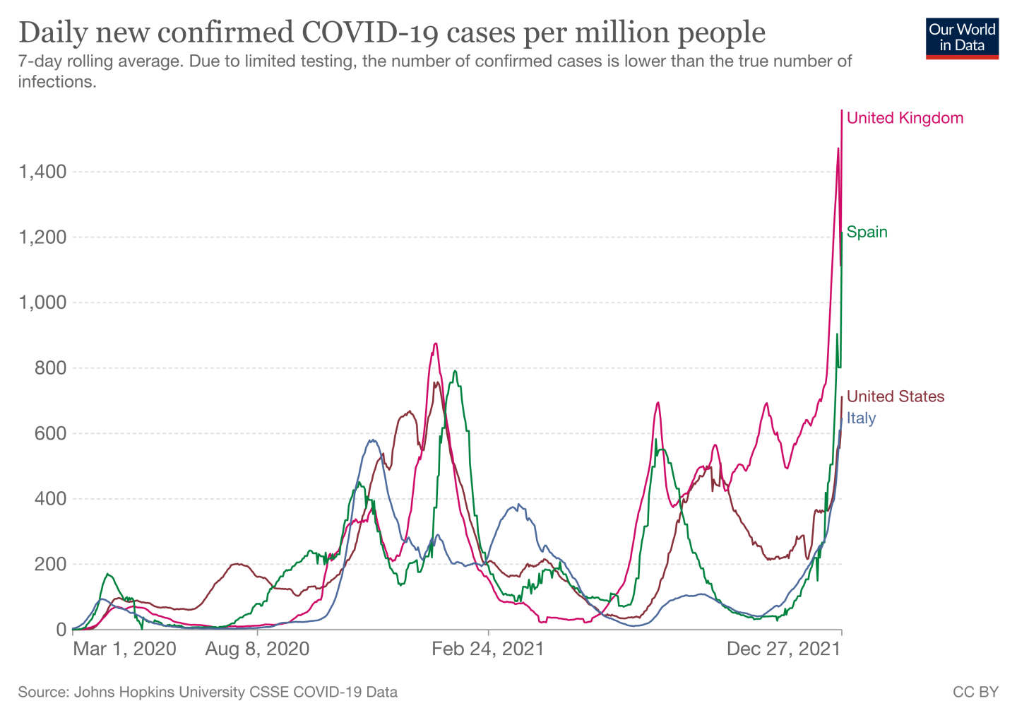 The Omicron variant is tearing through country after country, leading to the highest infection rates yet seen in the pandemic. Global COVID infections hit a daily record of more than 1.4 million confirmed cases on Monday.