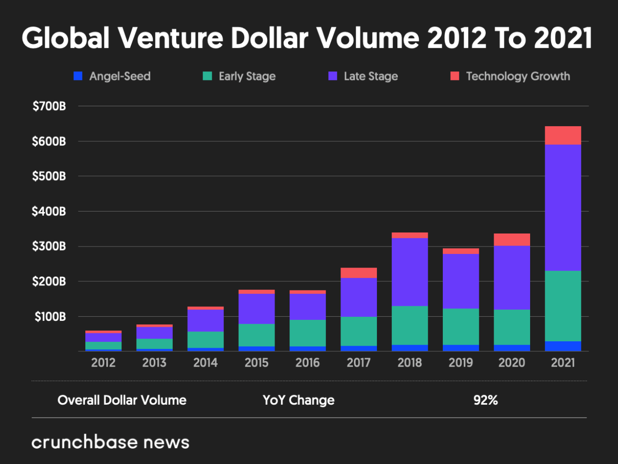 Of course, funding is up at every stage, with a total of $643 billion delivered to startups in 2021—92% growth from 2020, per Crunchbase. Later-stage funding rounds still make up the predominant portion of funding, as one would expect. Here’s a look at all of the dollars invested in startups last year: