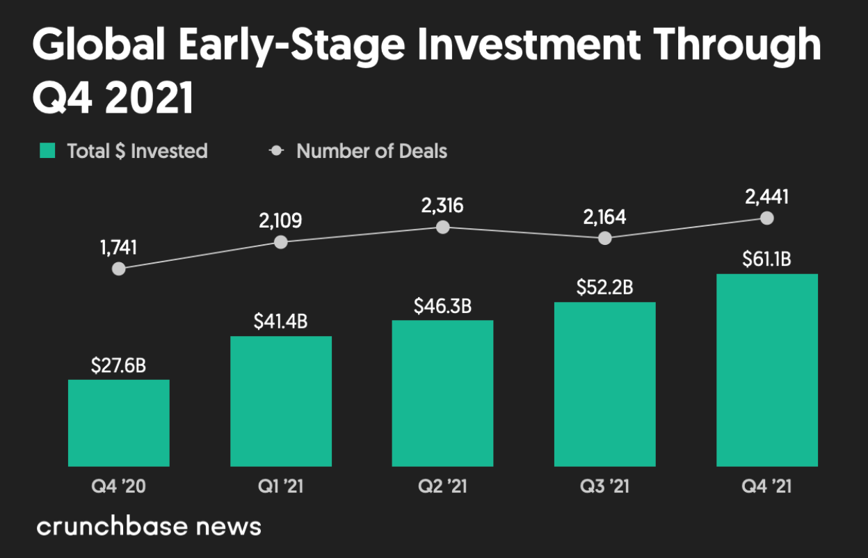 Early stage funding in global startups notched $201 billion in 2021, according to Crunchbase data. That’s $100 billion more in funding than the year prior. Approximately $29.4 billion went to seed-stage startups, in particular.