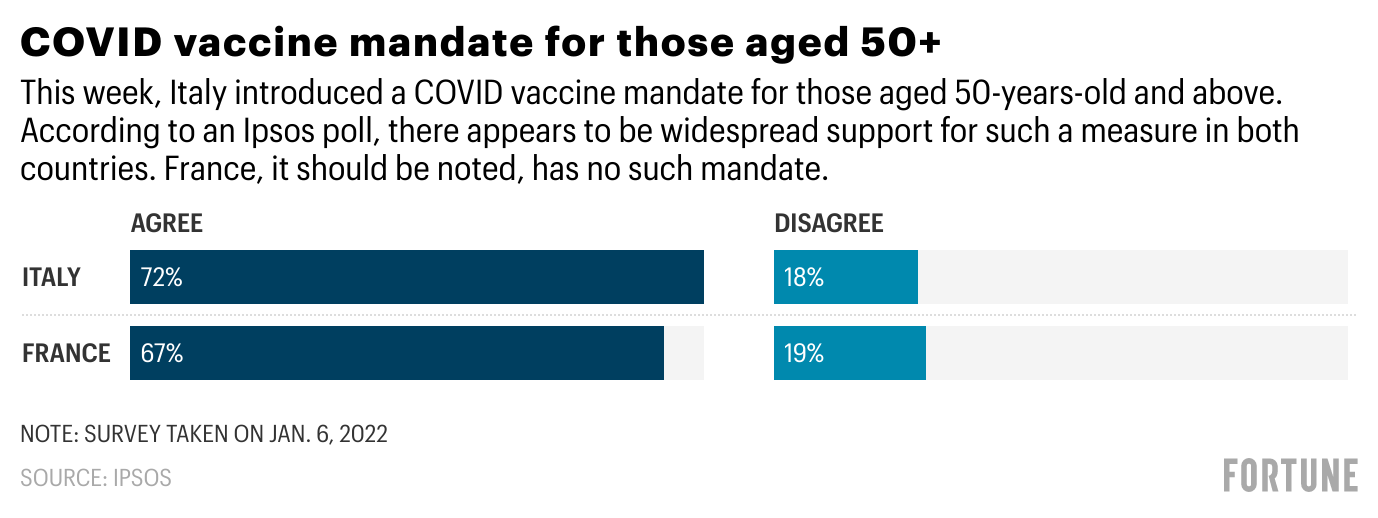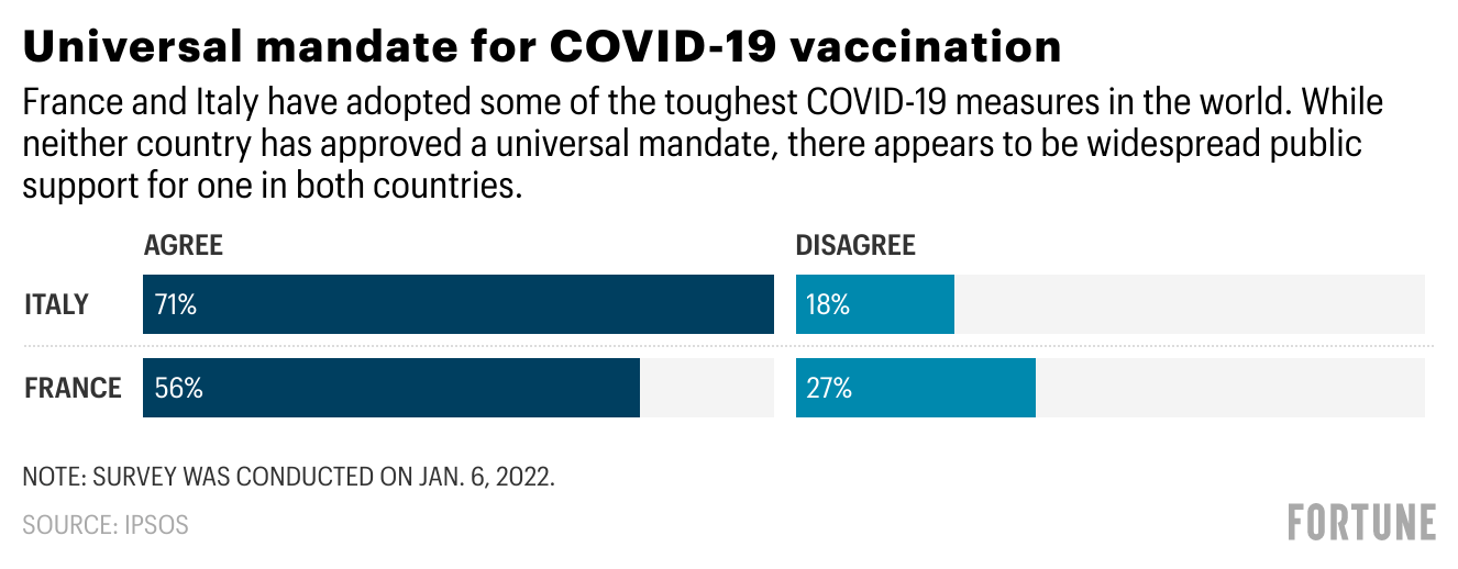 Even so, in France, where Macron faces a reelection battle in April, there are limits to people’s support. About 53% of the 1,000 people Ipsos polled in France supported the hard-line new mandate. That is lower than earlier data before Christmas from the polling agency Odoxa, which showed that two-thirds of people supported the vaccine mandate. And yet Macron still faces a fierce political battle to push his plan through.