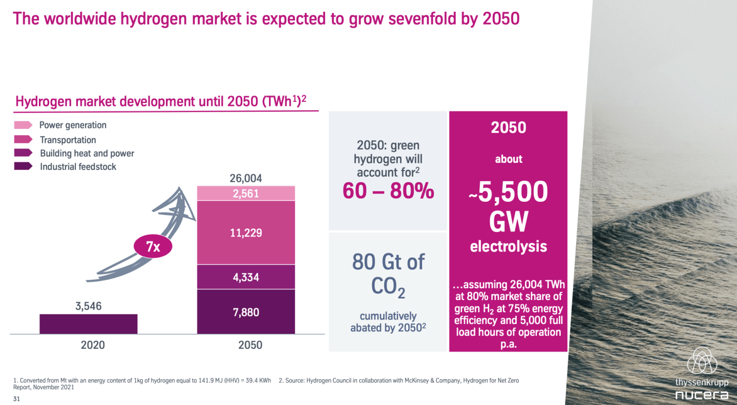 The ThyssenKrupp subsidiary sells electrolyzers that can split molecules of water, rather than those of methane, with the help of an electrical current provided by wind or solar. By 2050, it estimates 5,500 gigawatts of electrolyzer capacity will be installed (up from a negligible amount today).
