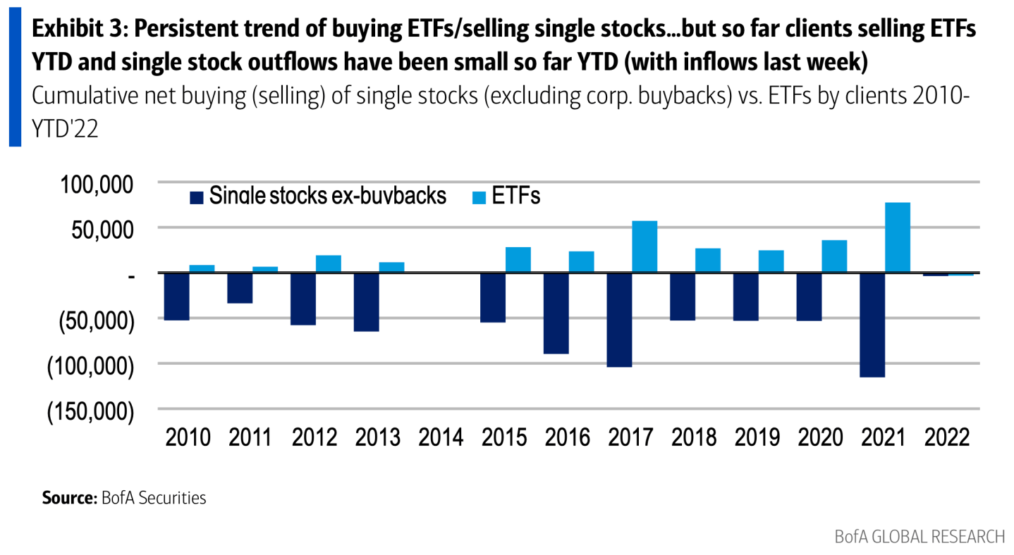 Even though the numbers are slight, BofA’s Jill Carey Hall and Savita Subramanian see the move as a further sign of investors recalibrating strategy. Out are “passive” trades like ETFs. In are “actively managed” trades like buying and selling individual stocks as the field of presumed winners dwindles ahead with uncertainty on the horizon.