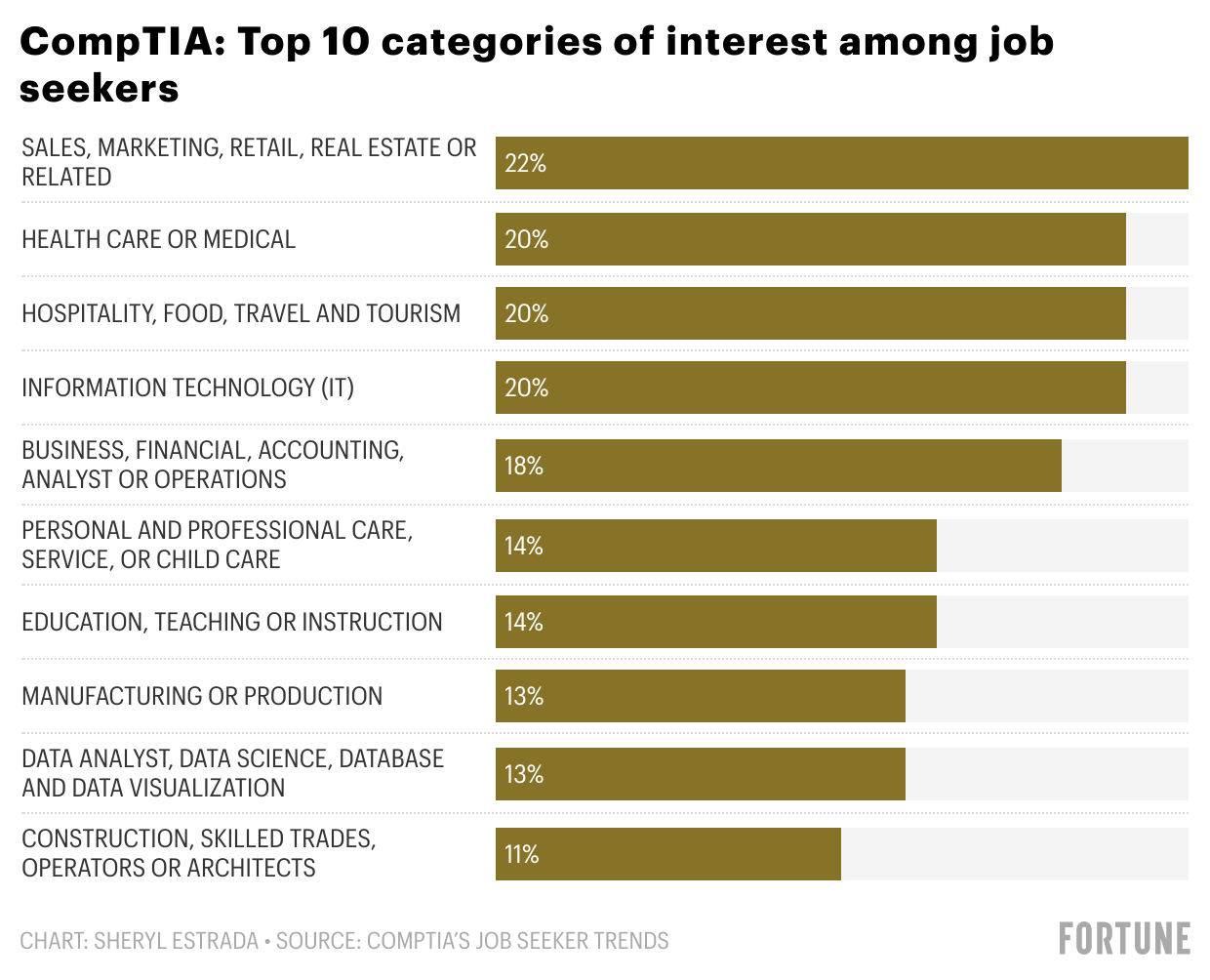 Information technology (IT) positions are becoming increasingly popular, according to CompTIA's latest Job Seeker Trends Report released on Feb. 1. About 20% of respondents are looking for jobs in the IT occupation category, which is a 7% increase from June 2021. That is the greatest increase among the survey's employment categories, the report found. However, the top job search category (22%) was sales, marketing, retail, and real estate. CompTIA also found that interest in the business, financial, accounting, analyst, and operations category experienced 4% growth from June 2021. The findings are based on a survey of 1,119 U.S. job seekers conducted by CompTIA, a nonprofit IT association.