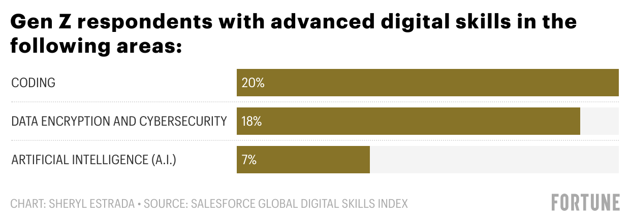It's just an assumption that younger generations feel more prepared for the digital skills needed for today’s jobs, according to new research. The Global Digital Skills Index recently released by Salesforce is based on a survey of over 23,000 workers in 19 countries. Overall, workers scored 33 out of a possible 100 points on the Digital Skills Readiness Index in areas such as preparedness and skill level. In the U.S., workers scored 36 out of 100 points. Just 31% of Gen Z respondents said they feel “very equipped” for a digital-first job right now. Less than a quarter (20%) believe they have advanced digital skills in coding and just 7% in artificial intelligence. However, more than one-third of Gen Zers surveyed are actively learning and training for skills needed over the next five years, in comparison to 12% of baby boomers, Salesforce found.