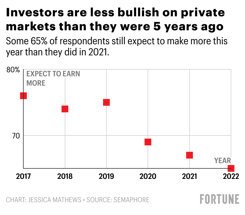 Private market investors have slowly become less optimistic about their short-term earnings on investments over the last five years, according to Semaphore’s 2022 annual confidence survey, which polled more than 500 private equity, venture capital, and hedge fund investors; limited partners; operating executives; investment bankers; and third-party vendors or advisers. Here’s a look: