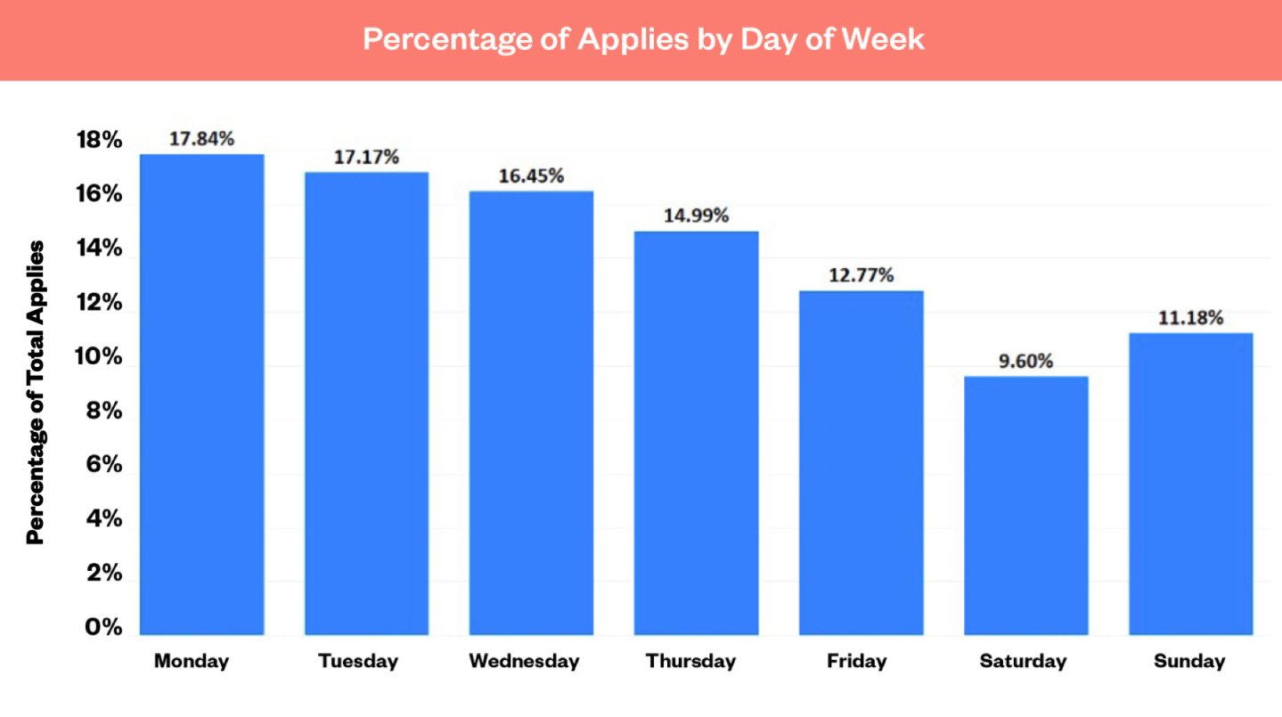 The 2022 Recruitment Marketing Benchmark Report by Appcast, a recruitment advisor, is based on an analysis of 165 million job ad clicks (and 8 million applies) from nearly 1,200 employers. As the war for talent continues, what's the best day to post job openings? Organizations continue to receive the most applications on Monday. The report takes a look at the state of hiring, including the cost of recruitment and advertising over the past year, along with the state of remote work.