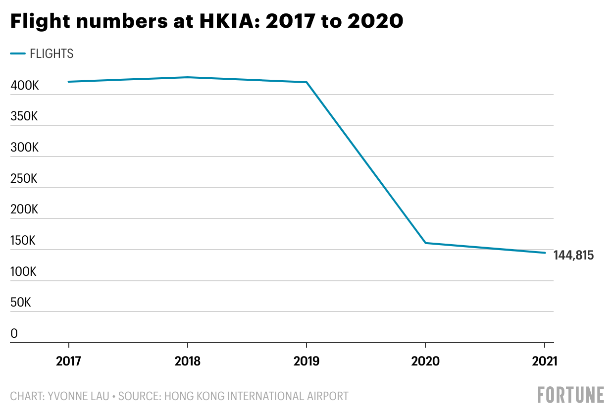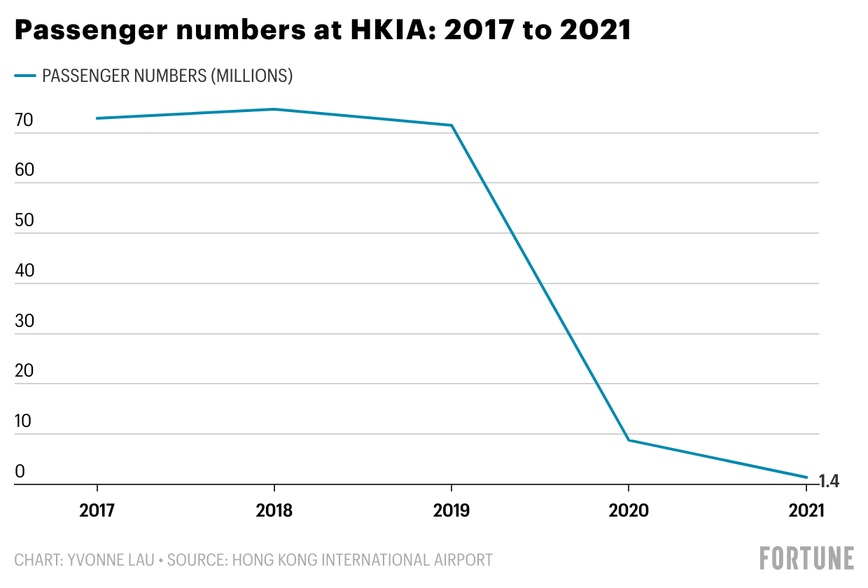 The rollout of effective vaccines helped travel rebound globally in 2021, but Hong Kong maintained strict “COVID-zero” rules for incoming travelers—even fully jabbed ones—and its passenger and flight figures deteriorated further. Only 1.4 million people flew in and out of the Hong Kong airport last year, while 144,815 planes took off or landed.