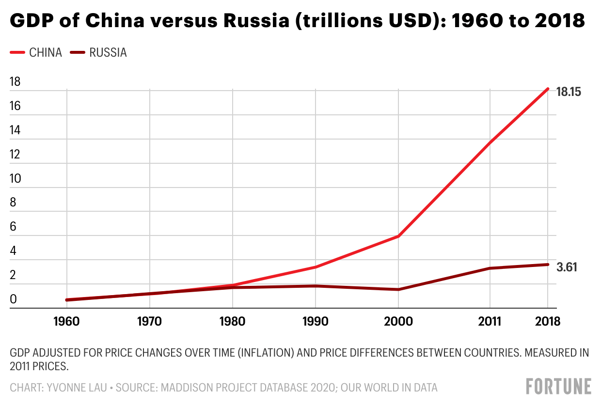 China and Russia developed at wildly different trajectories in the past several decades. From 1950 to 1980, China’s and Russia’s GDP were largely on par. But by 1990, the two nations’ growth diverged. The Soviet Union’s collapse in 1991 shattered its economy. Russia had to build a new country and new economic system. Meanwhile in the 1980s, China, under the leadership of Deng Xiaoping, began pursuing a new, open-door economic policy to bring investment and technology into the People’s Republic.
