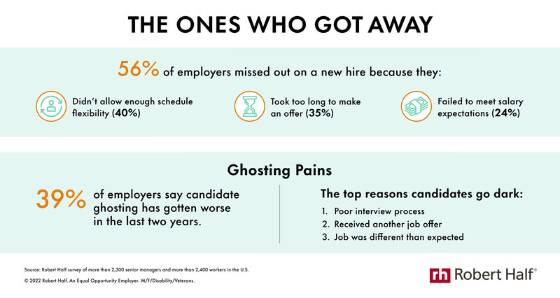 A recent report by Robert Half (NYSE: RHI), a talent and business consulting firm, reveals several factors, including candidate ghosting, making hiring more difficult. A survey of more than 2,300 senior managers in the U.S. found 39% said it's more common for job candidates to cut off communication now than two years ago. Managers hiring for tech (48%) and administrative and customer support (42%) roles were most likely to report an increase in ghosting, the report found. More than half (56%) of employers missed out on a new hire for reasons including lack of schedule flexibility (40%).