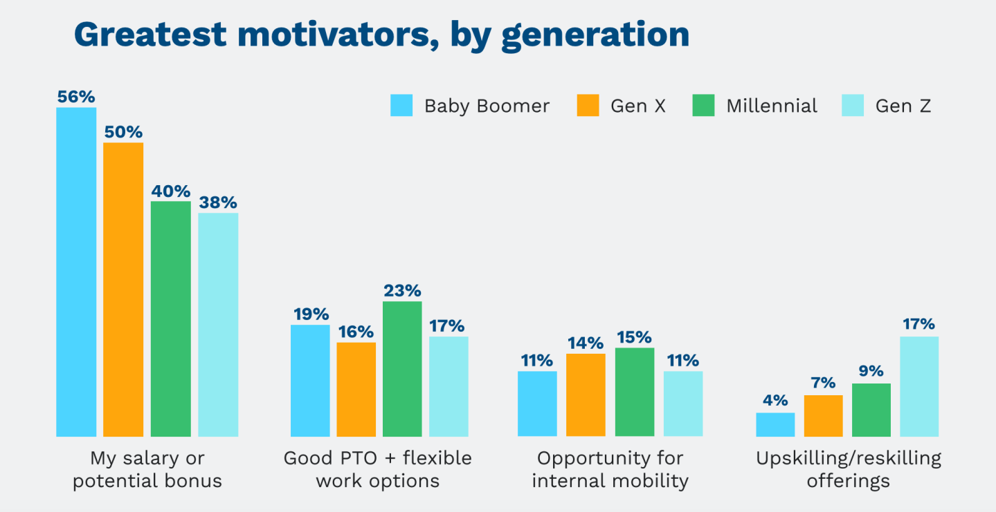Lever's State of Internal Mobility and Employee Retention Report, takes a look at how companies can best attract and retain employees. The biggest motivator for employees planning to stay in their position is salary and/or potential bonuses, followed by good paid time off and flexibility, according to Lever, a talent acquisition software company. However, Lever found that Gen Zers (17%) are most likely to stay at their current job because of upskilling/reskilling opportunities compared to Millennials (9%), Gen X (7%), or Baby Boomers (4%). The findings are based on a survey of 1,200 full-time, employed adults in the U.S. across various industries.
