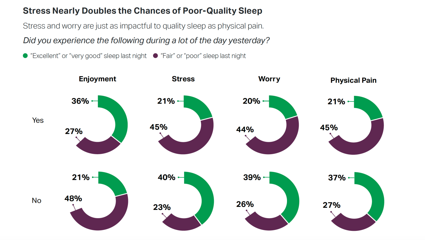 Did you get a good night's sleep? If not, stress may be a factor. Sleep company Casper and Gallup released the State of Sleep in America 2022 Report. The study surveyed over 3,000 adults in the U.S. ages 18 and over. About 45% of respondents who had difficulty sleeping said they experienced stress during the day. The report also found that age is a key factor in the relationship between disruption of sleep and stress. About 37% of respondents ages 50 to 64, and 24% who are 65 and older, said they experienced stress during the day leading to a restless night. In comparison, respondents ages 18 to 29 (64%), 30 to 39 (57%) and 40 to 49 (52%) said they experienced stress during the day, resulting in a poor night of sleep, according to the report.