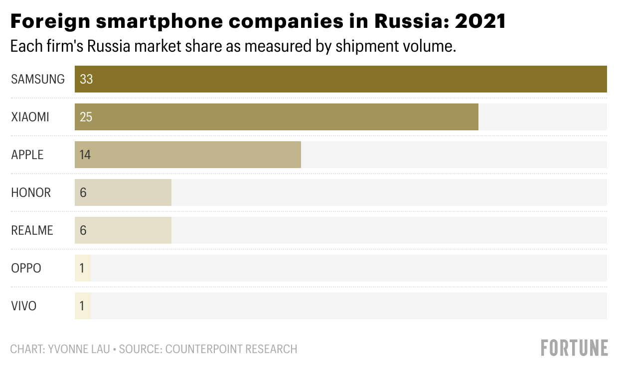 But the two companies’ exits from Russia will be a shock to the country’s consumers. The exodus will strip Russia of nearly half of its official smartphone supply. Apple and Samsung accounted for 47% of Russia’s smartphone market as measured by shipment volume in 2021, according to data from Counterpoint Research, a smartphone and semiconductor advisory firm.