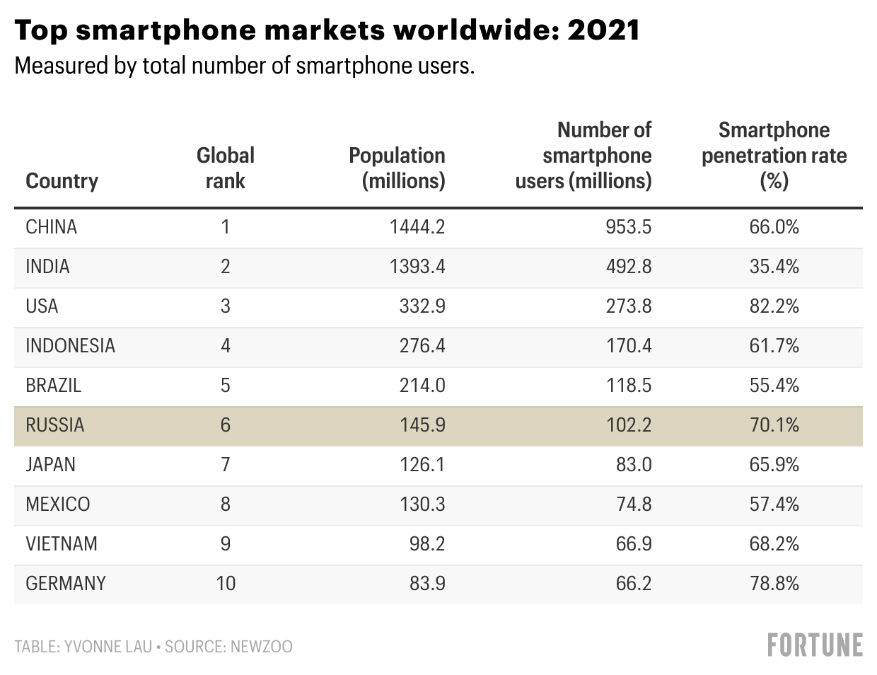 Russia is one of the word’s most digitally-connected countries. Over 85% of the Russians used the internet in 2020, compared to 71% in China and 41% in India, according to the World Bank. Around 70% of the Russian population, or 102 million people, own a mobile phone. Russia’s smartphone adoption rate ranks third worldwide, just behind the U.S. and Germany, according to a 2021 report by consumer data firm Newzoo.