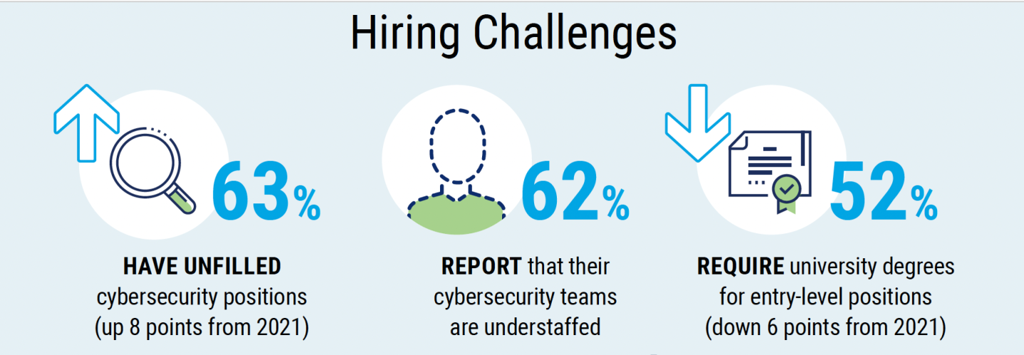 ISACA's State of Cybersecurity 2022 report focuses on the current trends in cybersecurity workforce development, budgets, and the threat landscape. About 82% of respondents said their leadership team sees value in conducting a cyber-risk assessment. However, just 41% said their organizations perform an annual cyber-risk assessment. Regarding workforce development, there are hiring challenges, the report found. About 63% of respondents said their organizations have unfilled cybersecurity positions, an increase of eight points from last year's survey. And most cybersecurity teams are understaffed (62%). Fewer organizations require university degrees for entry-level positions compared to last year's survey, the report found. The findings are based on a survey of 2,031 cybersecurity professionals. ISACA is an international professional association focused on IT governance.