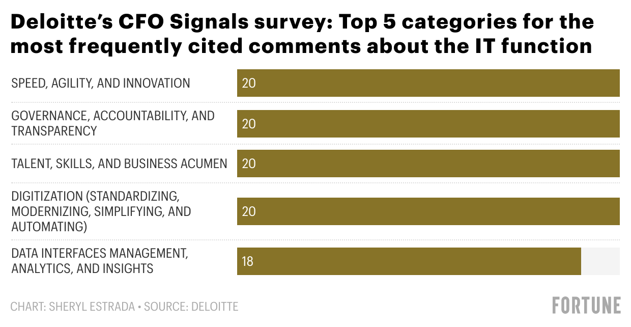The comments made by CFOs like, there’s a “dearth of technology professionals with intimate knowledge of the business they are trying to support,” there’s a need for “better communication with the business,” a need for “enhanced documentation and formalized policies,” and “speed,” fell into 11 different categories, Deloitte said. For example, there were 20 comments made about a lack of speed, agility, and innovation.