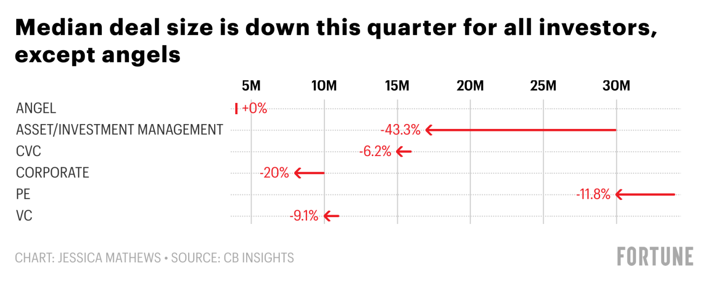 Mega-round funding is down 30% from last quarter, and it’s down in every sector except for angel investors, who tend to be most active in the early stages. Asset or investment management companies, corporations and corporate venture funds, private equity, and venture capital investors have all scaled back the size of deals they are signing. Valuations are up for early and mid-stage startups, but the median valuation for late-stage companies has begun to drop.