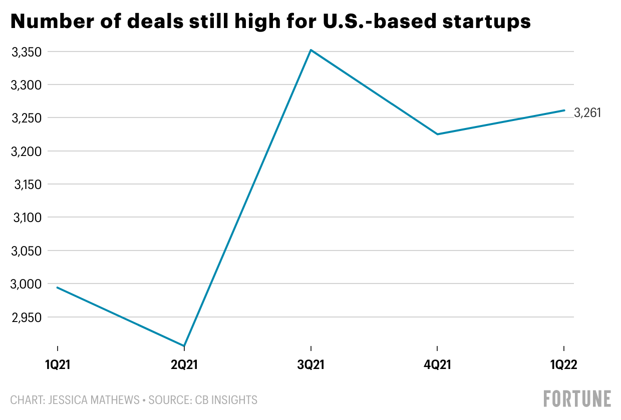 There’s still plenty of funding going toward startups in the U.S.—they received 49% of this quarter’s overall global funding—but the dollar-amount is at a five-quarter low after a record 2021. Funding was down in every major U.S. city apart from Philadelphia, Atlanta, and Dallas—although, there were more deals signed in the first quarter than there were the year prior.
