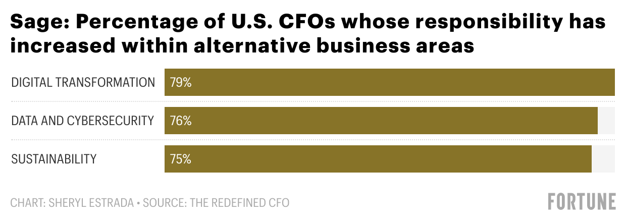 A new report, The Redefined CFO, released by Sage (FTSE: SGE), a software company providing technology for small and medium-sized businesses, examines how finance leaders are taking a more holistic approach with a reliance on data to engage with their companies' wider strategic priorities. About 98% of U.S. CFOs surveyed agree that, similar to CEOs, they’re "embedded into nearly every facet of the operation of their business," according to the report. For example, 79% are involved in the digital transformation process, 76% said data and cybersecurity are under their purview, and 75% noted they have greater responsibilities in the area of sustainability. The findings are based on a global survey of 1,900 finance leaders (500 respondents from the U.S.) at businesses with less than 1,000 employees and annual revenue of at least $50 million.