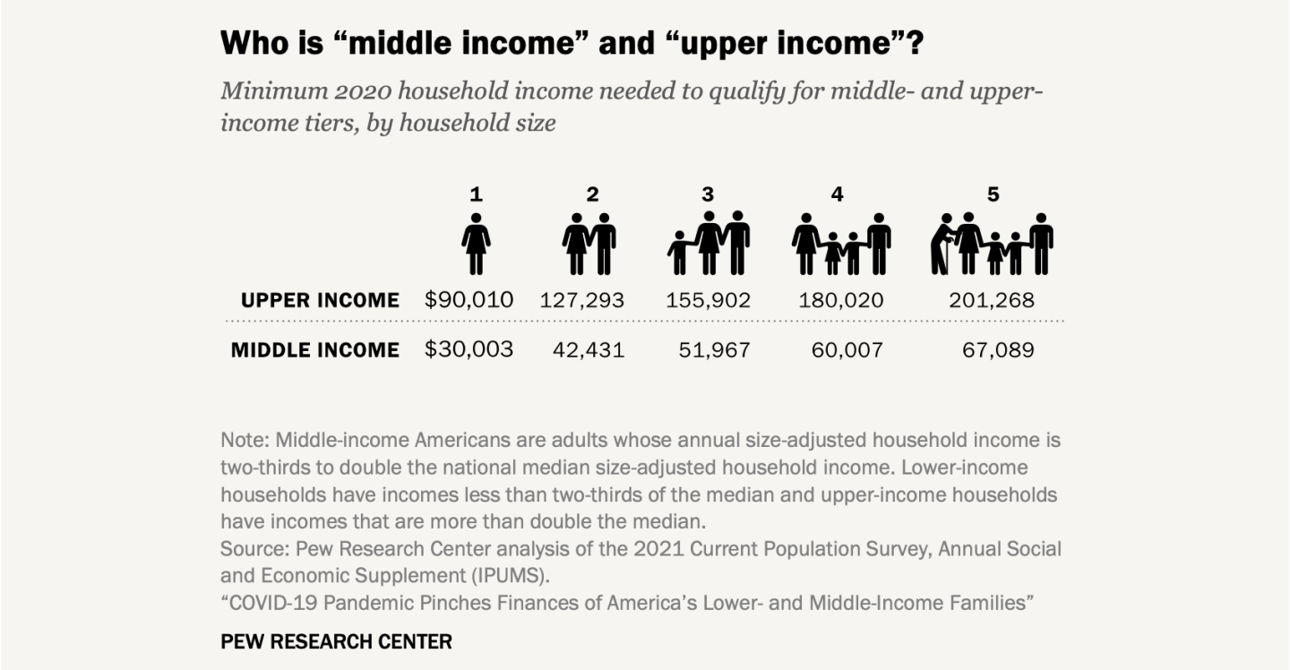 The Pew Research Center has put a financial definition to the term “middle income.” To be considered part of that group in 2021—which is synonymous with middle-class, according to Pew—a single American must have earned $30,003 to $90,010, according to a new set of reports released Wednesday.
