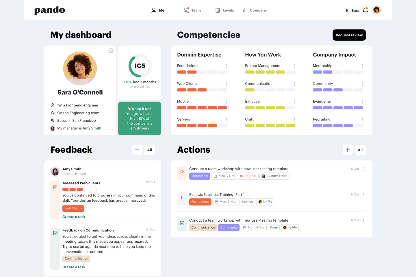 The Pando platform allows employees and managers to continuously track competency scores on things like communication, project management, mentorship, community-building and other contributions to the workplace. Companies are encouraged to develop clearly communicated hierarchies based on the skills required to advance to the next level.