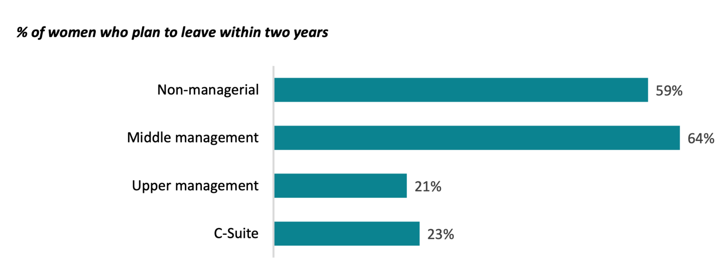 Deloitte's Women@Work 2022: A Global Outlook examines how women’s experiences in the workplace impact their engagement and career progression. The research shows a modest improvement in women’s work/life balance from last year's survey. But lack of opportunities to advance in the workplace and burnout are top reasons why women are eyeing the door. One in 10 of the women surveyed said they’re actively looking for a new role. And more than half of women plan to leave their employer within two years. This is most pronounced for women in middle-management (64%) and non-managerial roles (59%). However, just 10% of women plan to stay with their current employer for more than five years. The findings are based on a survey of 5,000 women across 10 countries and sectors.