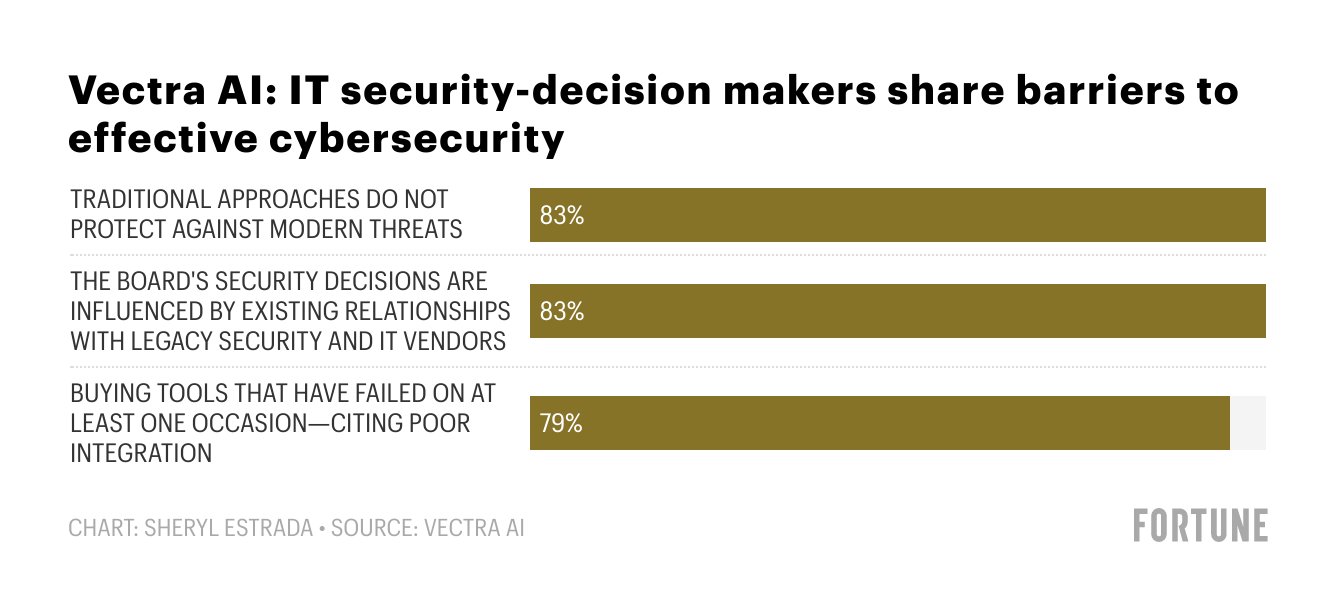 The latest report by Vectra AI, which provides AI-driven threat detection and response, delves into cybersecurity issues. A global survey of 1,800 global IT security decision-makers at companies with over 1,000 employees, found 92% of respondents have felt increased pressure to keep their organization safe from cyberattacks over the past year. However, 83% said that traditional approaches do not protect against modern threats. And 83% also said their company's board of directors' security decisions are influenced by existing relationships with legacy security and IT vendors, the report found.