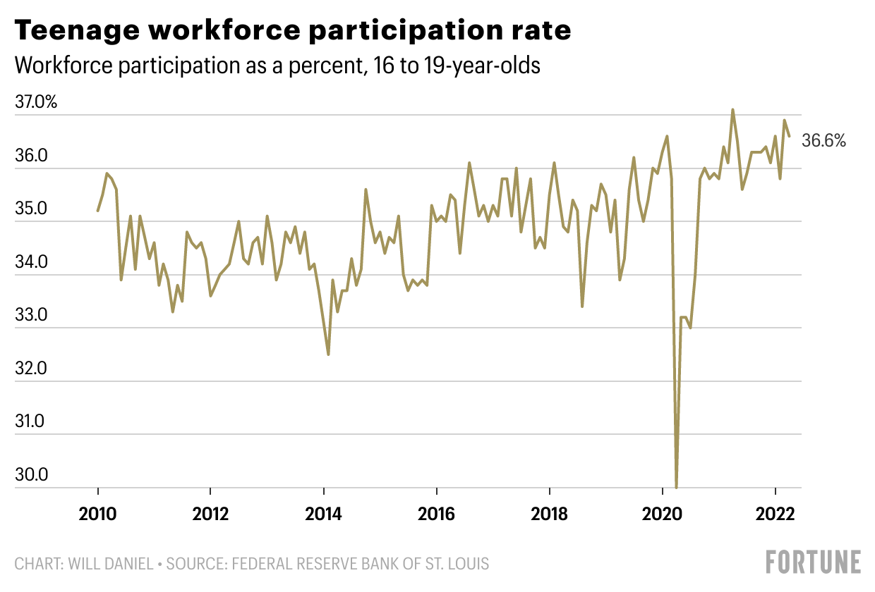 In April, 36.6% of 16-to-19-year-olds participated in the workforce, Federal Reserve data shows. That’s a big increase from the 34.7% average seen between 2010 and 2020, but it’s nowhere near the 51.2% average from between 1962 and 1980, when boomers were teenagers.