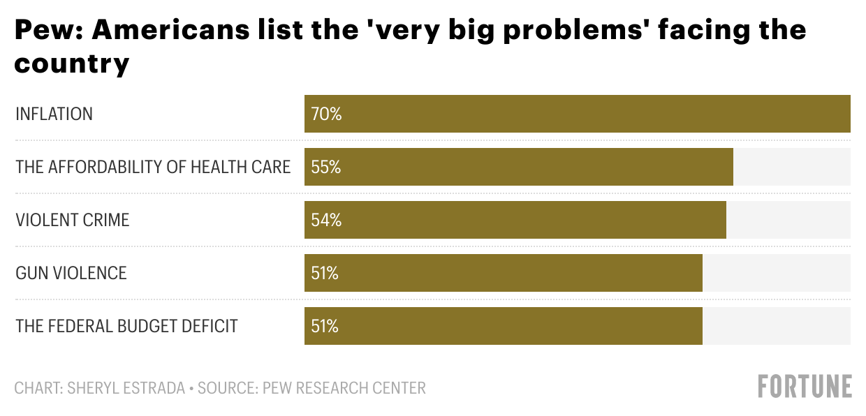 About 70% of Americans view inflation as a very big problem for the country, followed by the affordability of health care (55%), a report by Pew Research Center found. In comparison, just 19% of Americans currently rate the coronavirus outbreak as a very big problem for the country, compared to 58% in June 2020. "The public views inflation as the top problem facing the United States—and no other concern comes close," according to Pew. The findings are based on a survey conducted April 25-May 1 among 5,074 U.S. adults.