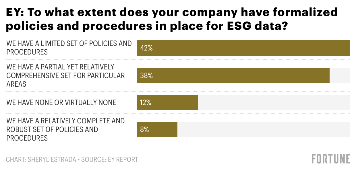 Finance professionals are being relied upon to support and reinforce ESG reporting efforts, according to a new report by EY US and the Financial Education & Research Foundation. The report found that 42% of respondents said their organization has limited policies and procedures for ESG. Meanwhile, just 8% have "relatively complete and robust" ESG policies and procedures. The findings are based on a survey of 72 chief accounting officers and controllers at US-headquartered publicly traded companies.