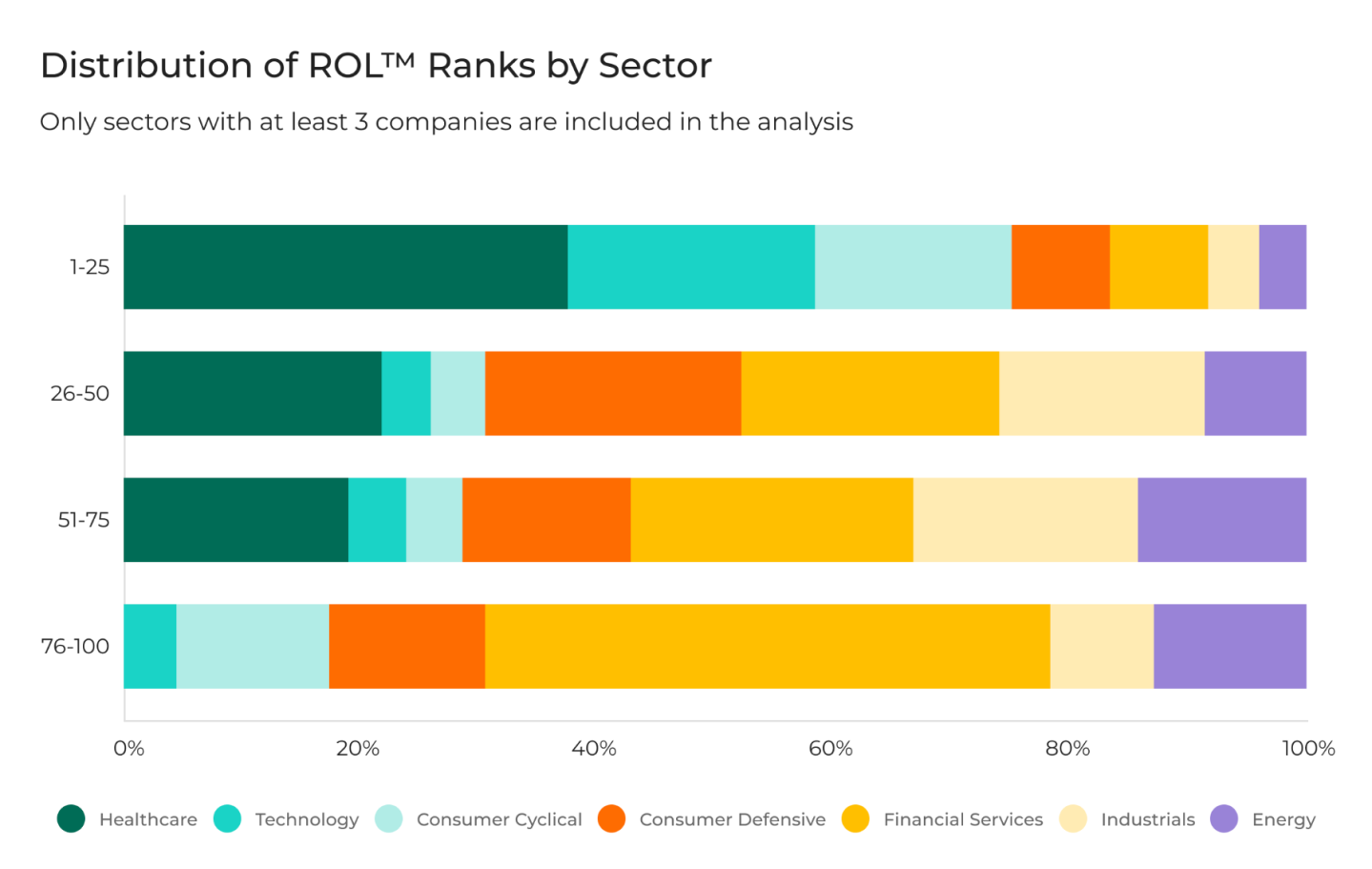 At the opposite end of the spectrum is the financial industry, where dollars—not purpose—still appear to be king. Among the top 25 companies in ROL100 ranking, two are financial services firms. While the bottom 25 includes 11 financial service companies.