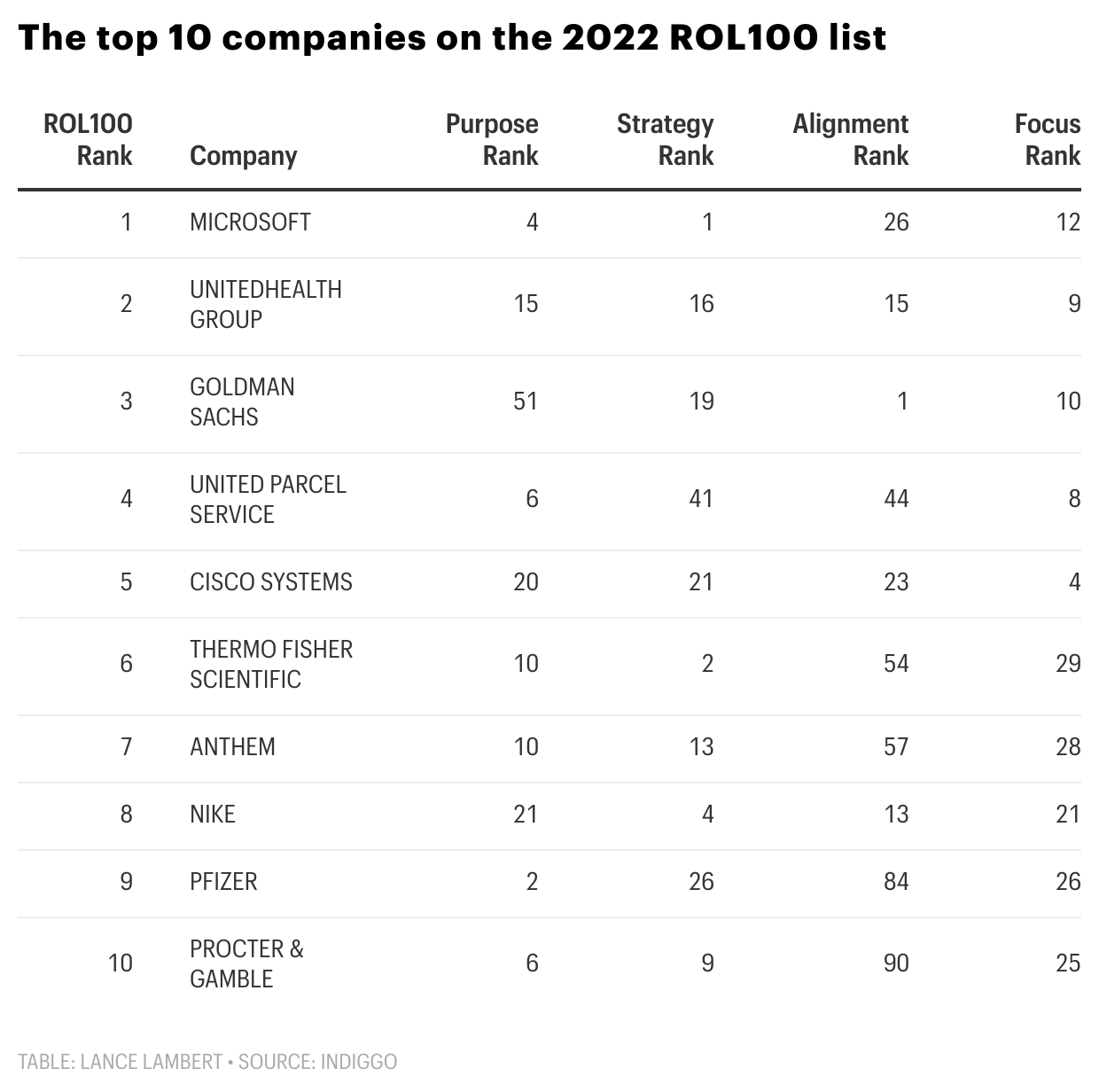 The ROL100 ranking assesses leadership execution from a stakeholder capitalism lens, and includes data on key areas ranging from integration of purpose and strategic clarity to leadership alignment. To calculate the ROL100 Ranking, Indiggo leverages its framework with publicly available information to provide an “outside-in” view of Return On Leadership. (To see the full list, go here).