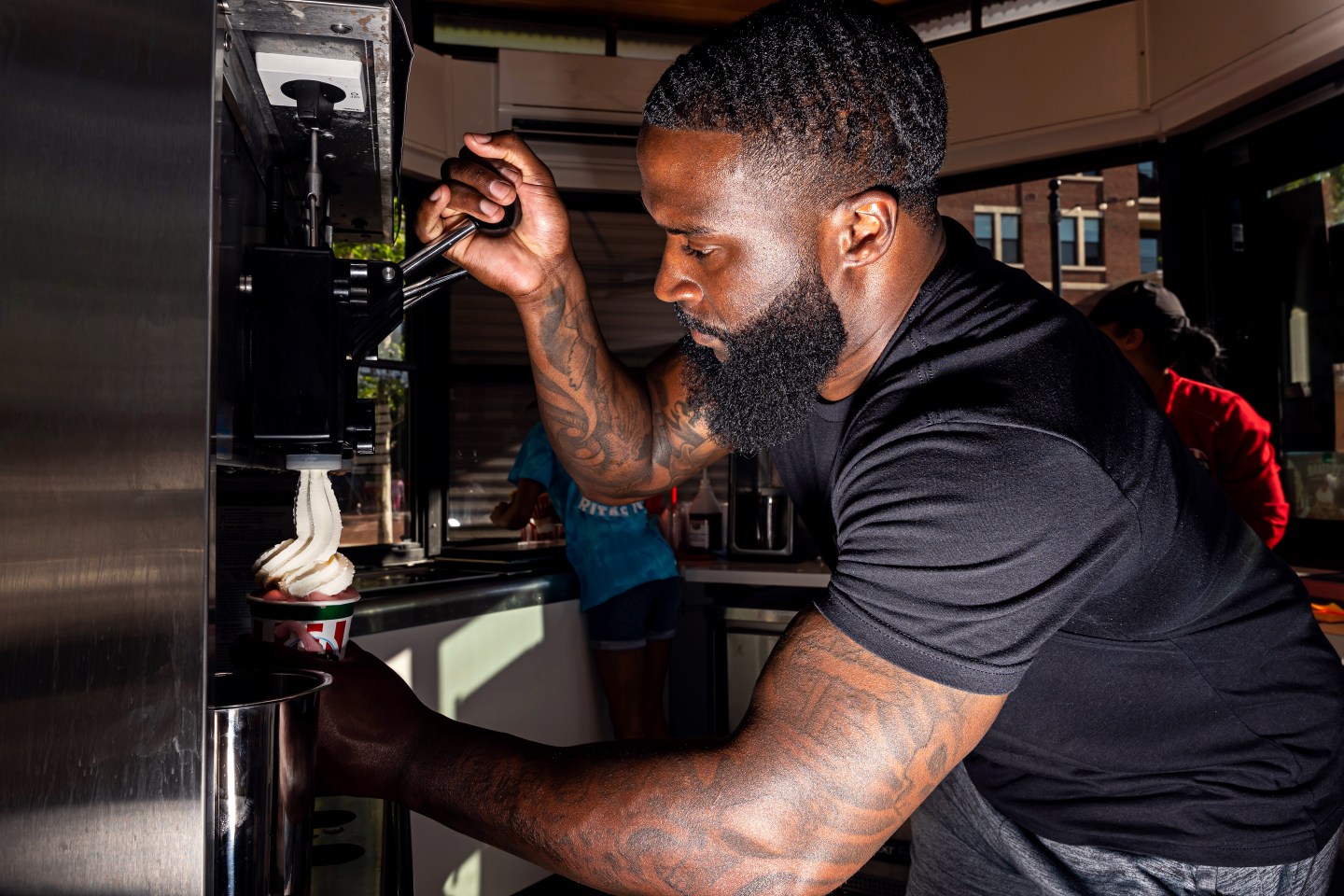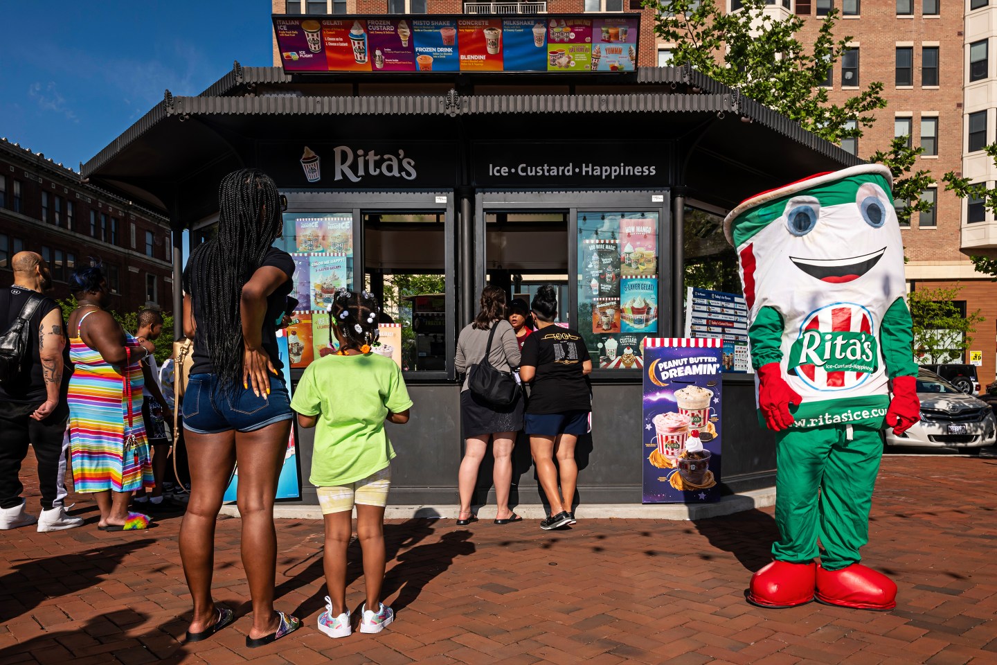 So Blackwell has altered what is within his purview: price and marketing. To get customers who paid $3 for a medium ice last summer to pay $7 this summer, he says, “I made my locations an attraction.” On humid afternoons, kids dart through sprinklers spraying rainbow-colored water while the anthropomorphic Rita’s and Auntie Anne’s mascots pose for selfies. Blackwell brings in saxophonists and comedians to entertain the crowds, and when the sun goes down, the movie projector comes out, showing Toy Story and other family-friendly films. Since he expanded events programming, his sales have quintupled, from $30,000 to $150,000 per month. “People don’t mind paying my prices,” Blackwell says. “They know when they come down here, they’re going to spend the day and enjoy themselves.”