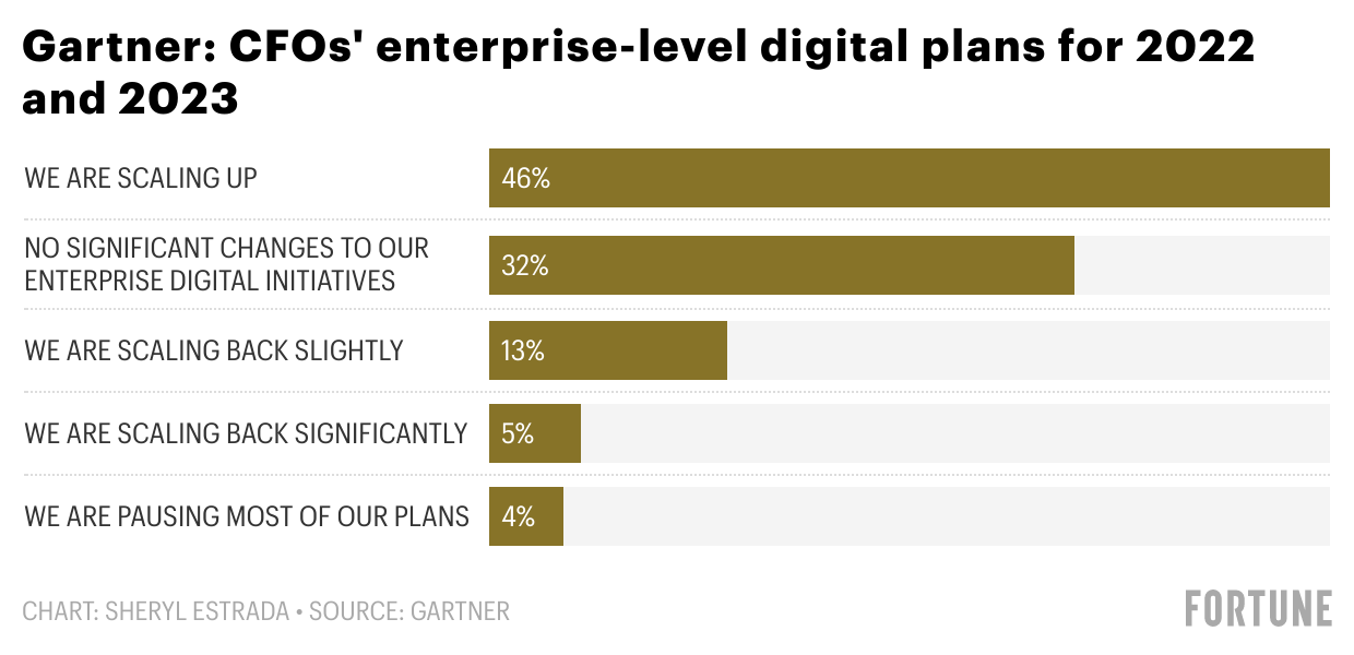 A new report by Gartner finds that CFOs view growth in tech as essential. In the next two years, 78% of CFOs surveyed plan to maintain or increase enterprise-wide digital investments, according to the report. And within their own finance departments, 52% of CFOs said they're scaling up digital investments, while 38% said they intend to maintain their current investment levels. The finds are based on a survey of 199 CFOs and senior finance leaders