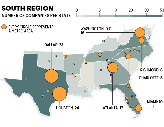 The Southern Region has the most Fortune 500 companies, and a large number of them are based in Texas and belong to the oil and gas industry. Phillips 66, KBR, and ConocoPhillips are only a few of the many energy companies that are headquartered in Houston; Sysco, the food-service company, is also based in that city. The pandemic hit the energy sector hard in 2020, causing $51 billion in losses that year. But then it rebounded in 2021, and Fortune 500 companies in that sector nationwide posted $128 billion in profits. The Fortune 500’s No. 1 ranked company, Walmart, is also in the region, based in Bentonville, Ark.