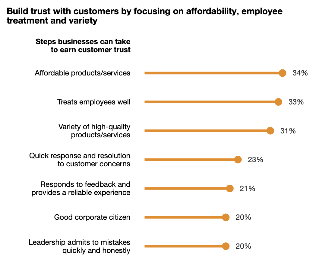Perhaps most interestingly, consumers expressed that how a company treats its employees is just as important as the quality, price, and variety of its products or services when it comes to building trust.