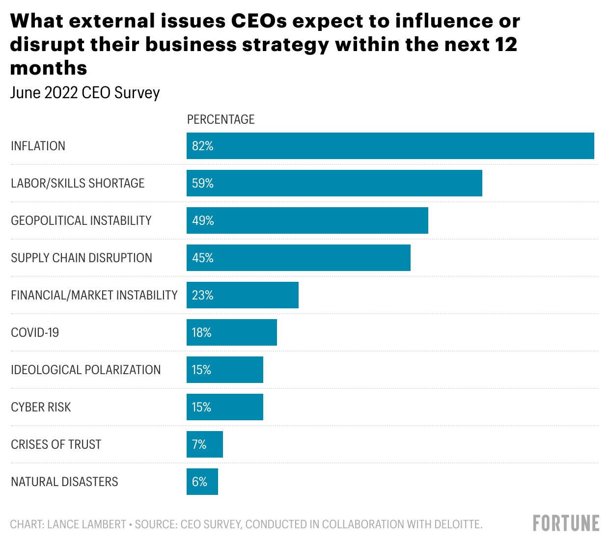 While the Fed has moved into full-blown inflation fighting mode, CEOs aren’t convinced inflation will go away anytime soon. Among the CEOs we surveyed, 82% expect it to continue disrupting business strategy over the coming year.
