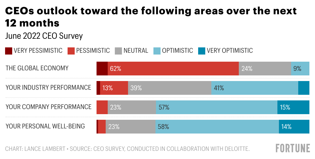 To find out, Fortune ran a new CEO survey, conducted in collaboration with Deloitte. We invited the top executives at Fortune 500 companies, Fortune Global 500 companies, and some members of our global Fortune community to participate. In total, 116 CEOs across the globe responded to the June 2022 survey.