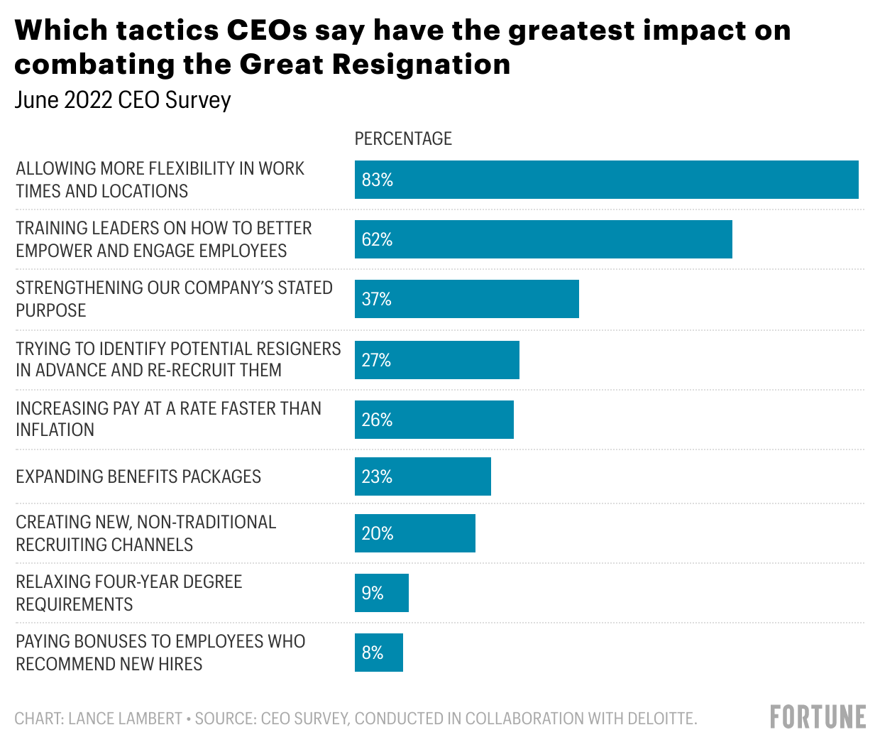 There’s no doubt about it: Every single CEO in America has been forced to face the realities of the tight labor market. To ease turnover rates, CEOs simply allowed many staffers to keep their WFH freedoms. Among the CEOs we surveyed, 83% said allowing more flexibility in work time and locations helped them combat the Great Resignation.