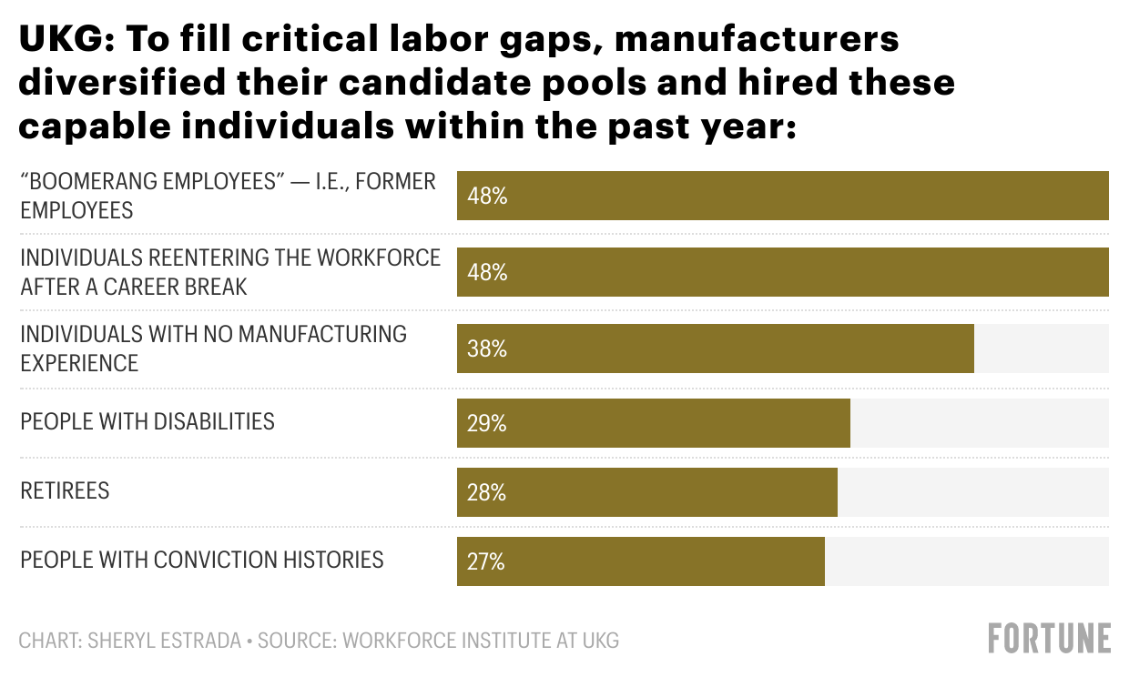 Research by Workforce Institute at UKG reveals challenges facing manufacturers as labor shortages and supply chain disruptions persist. To attract talent, 70% of manufacturers raised starting pay for hourly employees, according to the report. In addition, manufacturers have expanded their candidate pools by hiring former employees or "boomerang employees" (48%); individuals returning to the workforce after a career break (48%), individuals with no manufacturing experience (38%), people with disabilities (29%), retirees (28%), and people with conviction histories (27%). The findings are based on a survey of 300 HR managers, directors, and executives representing U.S. manufacturers.