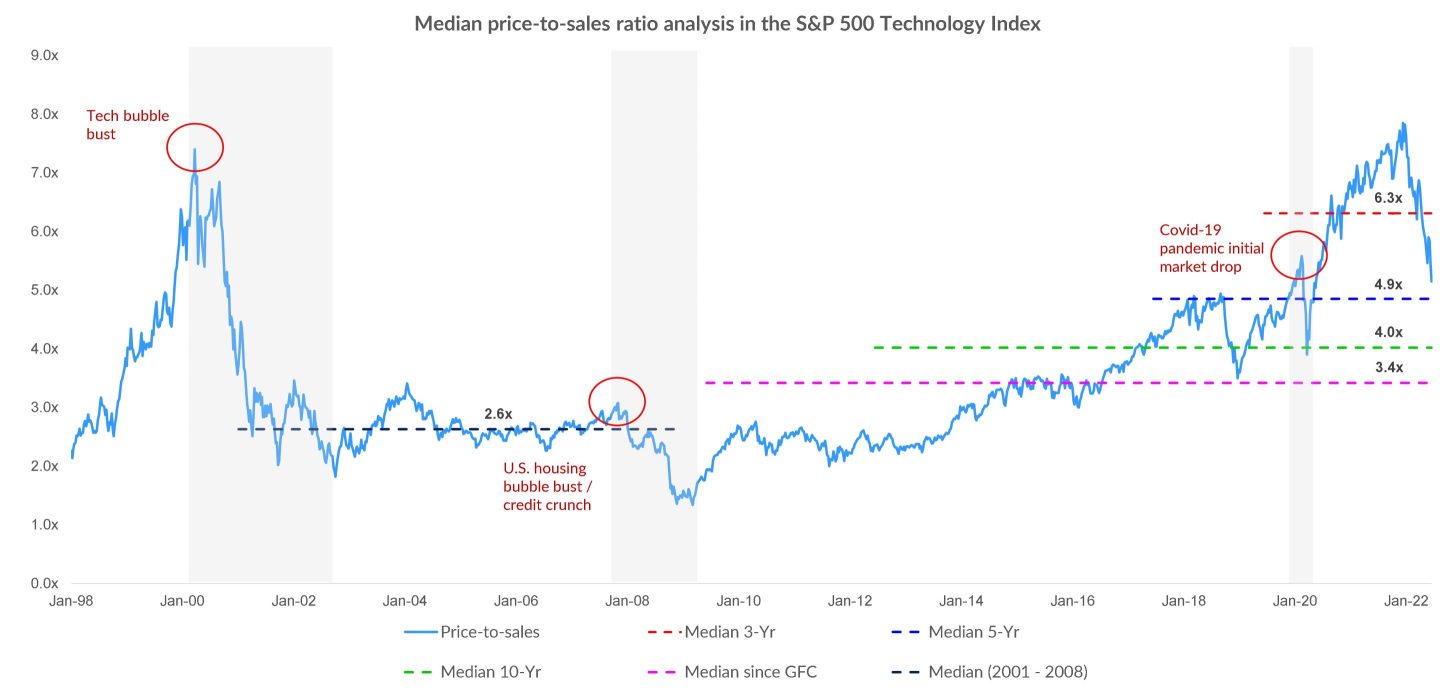 While we can’t predict the future, as tech multiples head quickly toward their five-year median, it’s not unreasonable to believe that it will take years to reverse.