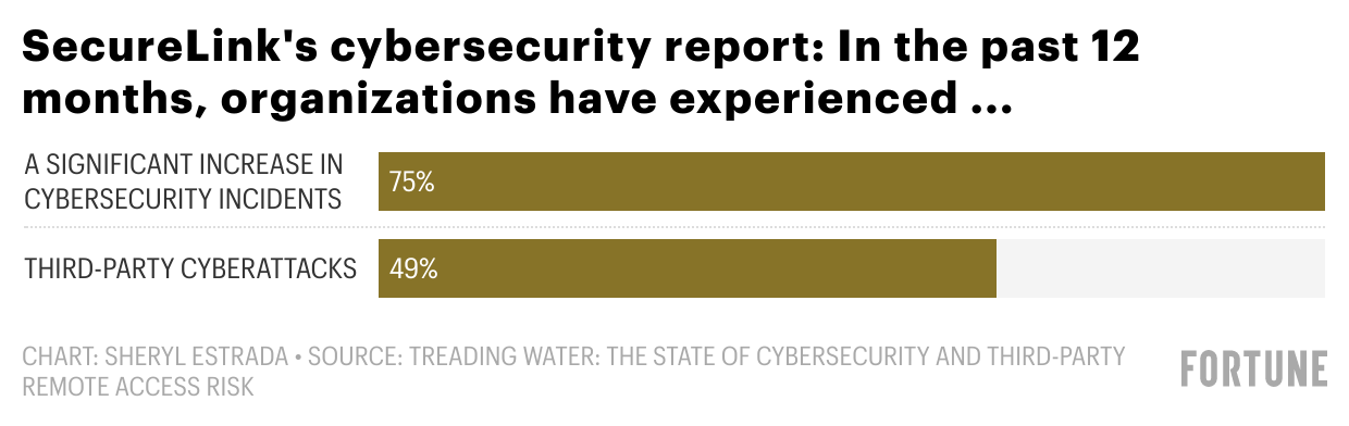 A new report by SecureLink and Ponemon Institute, “Treading Water: The State of Cybersecurity and Third-Party Remote Access Risk," found mitigating cyberattacks remains an issue in organizations. The findings are based on a survey of 632 IT and security professionals in the U.S. financial services, healthcare, education, and industrial and manufacturing industries. About 75% of respondents said they have seen a "significant increase" in security incidents in the past 12 months, most often due to credential theft, ransomware, DDoS and lost or stolen devices, according to the report. And 49% said their organizations have experienced third-party attacks in the past 12 months compared to 44% at the same time a year ago. The survey also found the majority of respondents (70%) said a third-party breach came from granting too much access.