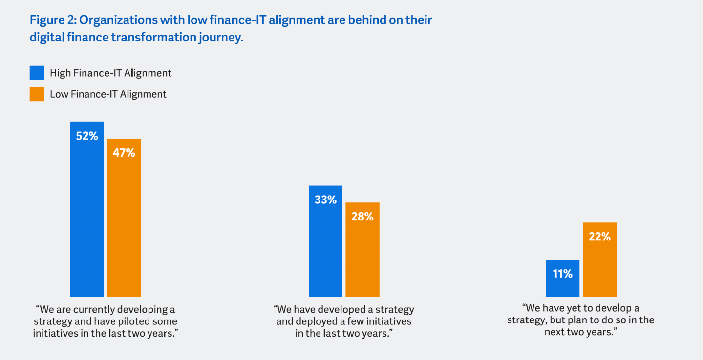 The research found there’s a positive correlation between high finance and IT alignment, and the increased digital maturity of a company’s finance digital transformation.